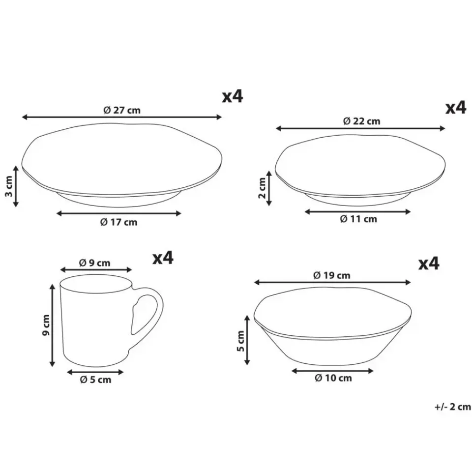 Aanbod omvat: 4 x Dinerbord, 4 x Dessertbord, 4 x Mok, 4 x Diepe borden
