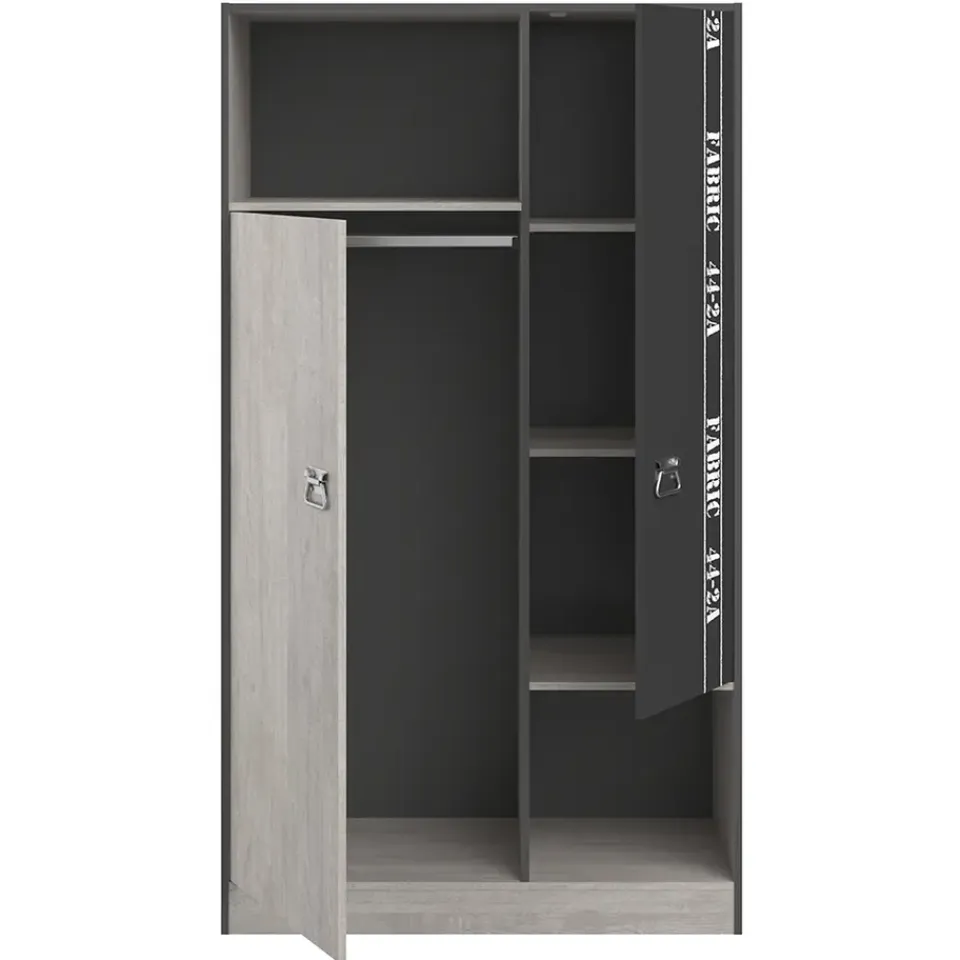 Kledingkast Fabric is een ruime kast met een speelse én stoere uitstraling. De kast is uitgevoerd in eikenkleur/grijs en de kast heeft twee draaideuren. Eén deur is uitgevoerd in eikenkleur, de andere deur is uitgevoerd in grijs. Omdat de deuren niet de gehele ruimte vullen, heeft deze kast ook twee ruime opbergvakken. Zo is de kast niet alleen functioneel, maar ook nog eens bijzonder leuk om te zien. Kledingkast Fabric heeft een totale afmeting van 181,5×101,4×50,5 cm (hxbxd) en is gemaakt van spaanplaat.