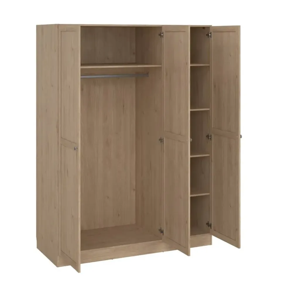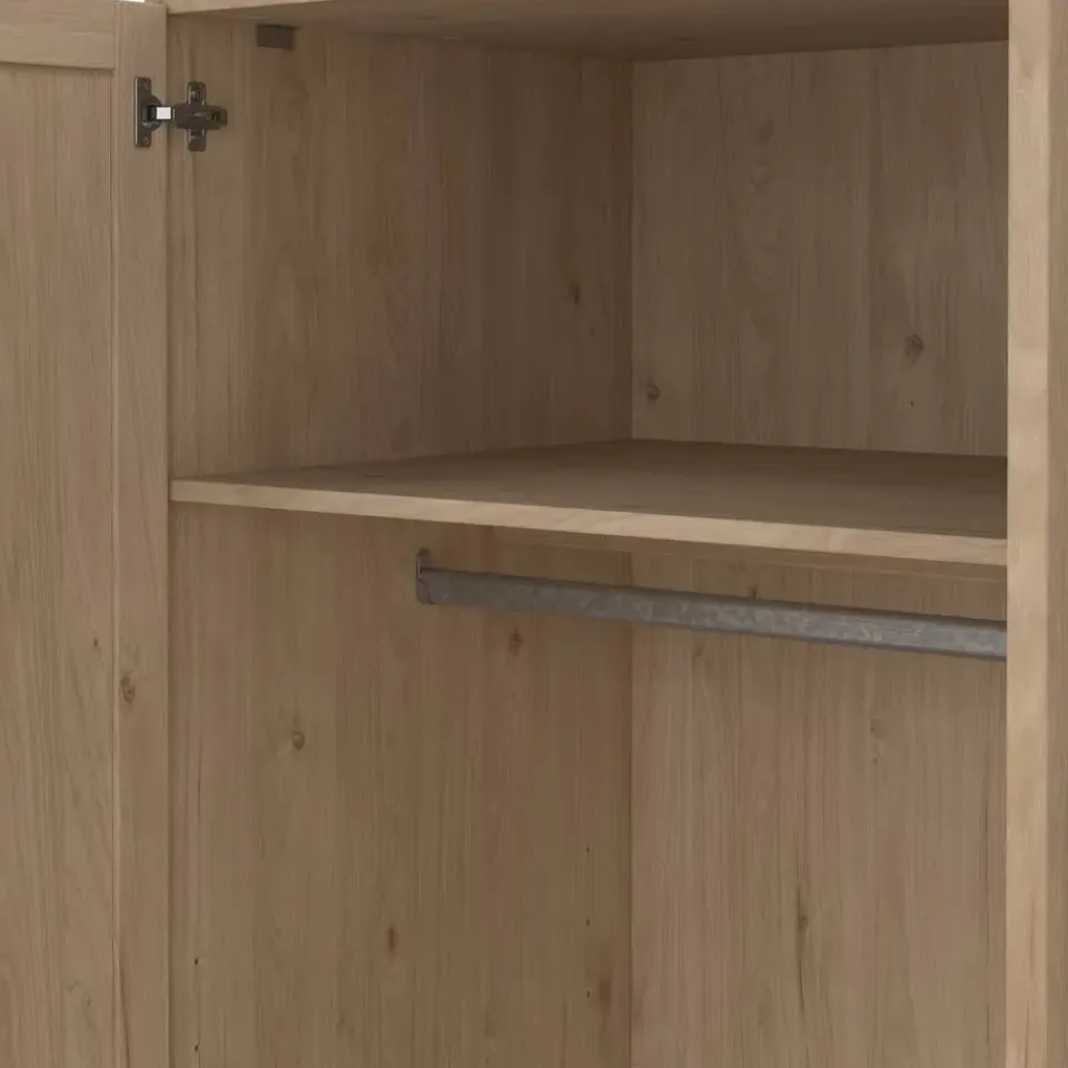 Kledingkast Lynn is een mooie en handige kledingkast in een eikenkleur. De strakke en moderne kader lijsten op de deuren zorgen ervoor dat de kast een mooie toevoeging is aan de slaapkamer, logeerkamer of kledingkamer.