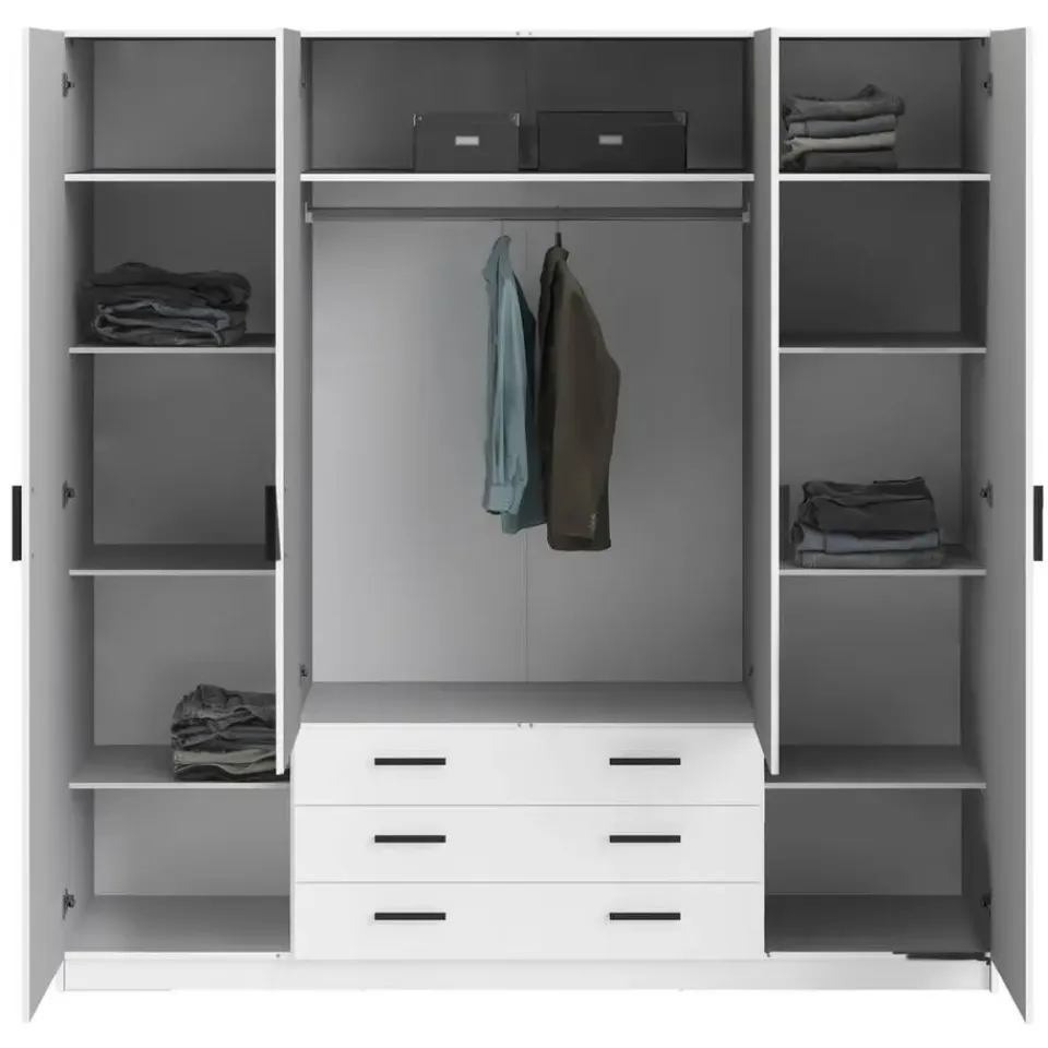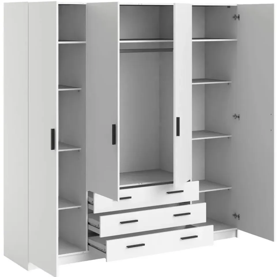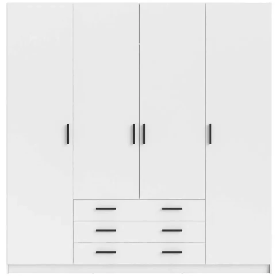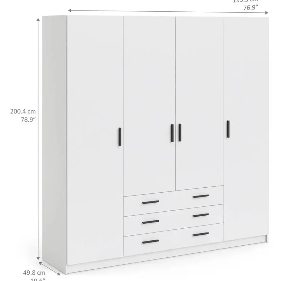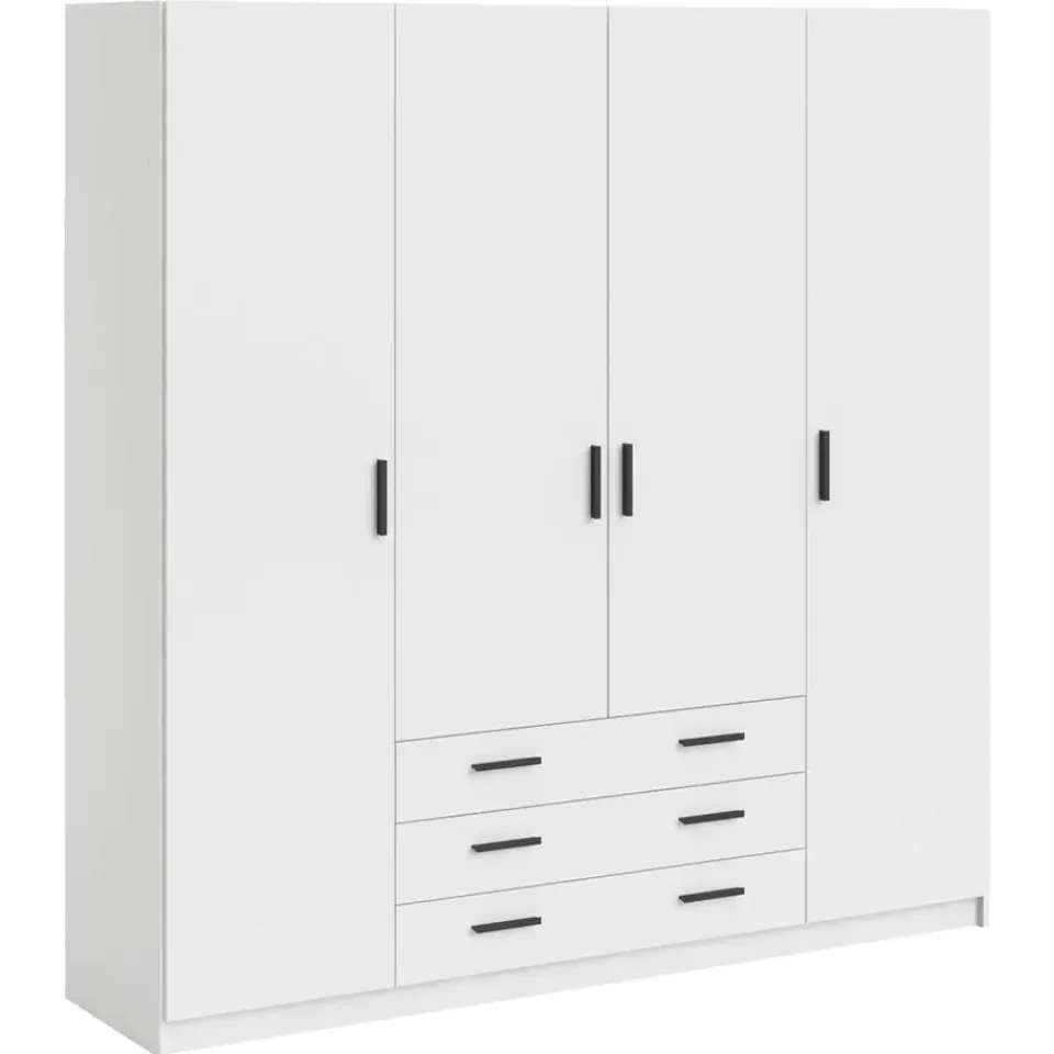 Deze tijdloze witte kledingkast Sprint heeft een moderne vormgeving. Kledingkast Sprint heeft 4 deuren en 3 ruime laden en biedt hierdoor voldoende opbergruimte voor al je kleding! De kast heeft een totale afmeting van: 200x196x50 cm.