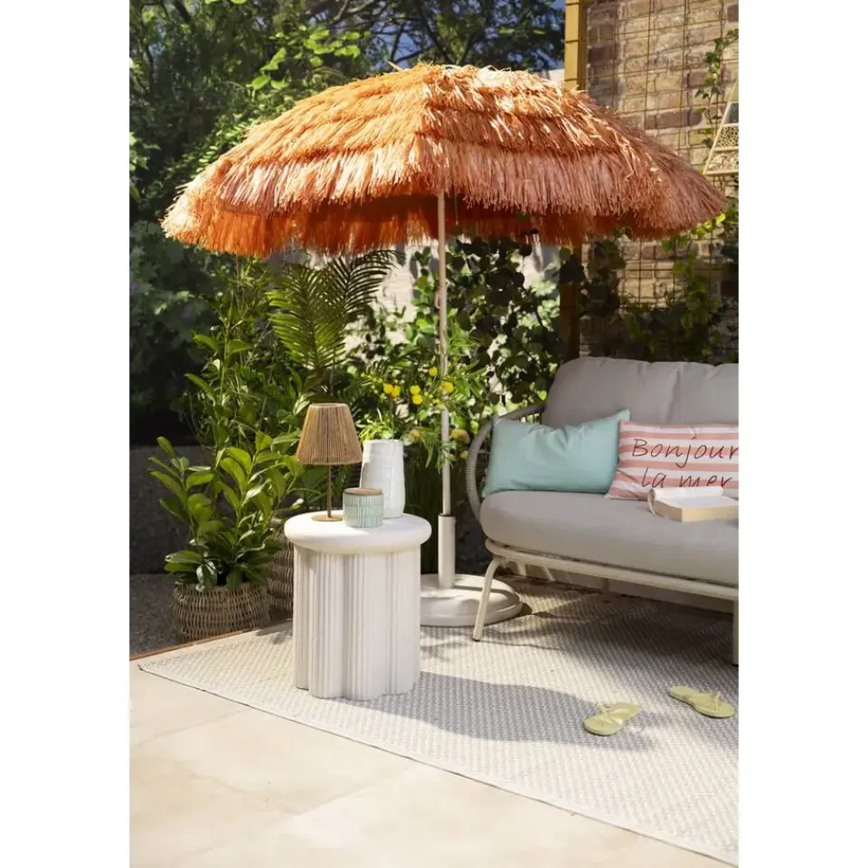 Parasol Palm Beach heeft een diameter van 200cm en komt in de kleur terracotta. Deze ronde parasol staat stevig door de metalen stok en is voorzien van een polyester doek met raffia afwerking. Of je een dagje naar het strand gaat, naar de camping of je gewoon in je eigen tuin zit, met deze handige parasol ben je gegarandeerd van het ultieme zomergevoel.