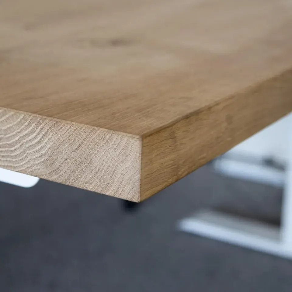 Bij onze massief eiken bladen wordt de stam in planken (lamellen) gezaagd, waarna ze onder hoge druk aan elkaar worden gelijmd. Hierdoor wordt het eiken blad erg stevig. Onze 160×80 en 180×90 bladen zijn voorzien van staalprofielen aan de onderkant, om zo natuurlijke werking te voorkomen.