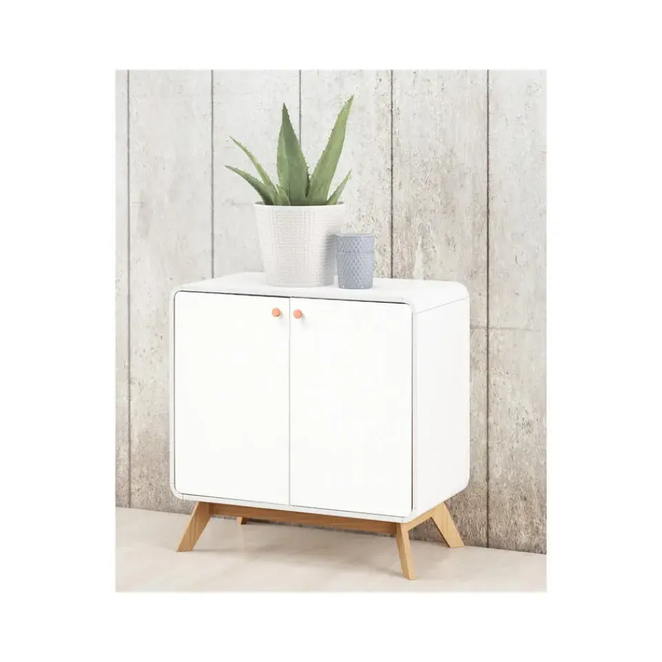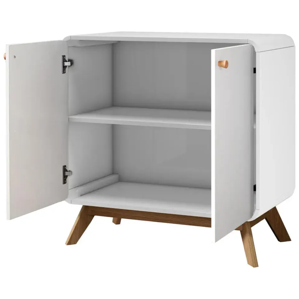 Dit dressoir is de droom van een designliefhebber en lost opbergproblemen stijlvol op. Het tweekleurige kleurenpalet, het slanke silhouet, de afgeronde hoeken en taps toelopende poten dragen bij aan de Scandinavisch geïnspireerde uitstraling, terwijl de twee binnenplanken voor veel opbergruimte zorgen. Hij is verkrijgbaar in verschillende afwerkingen om bij je bestaande inrichting te passen.