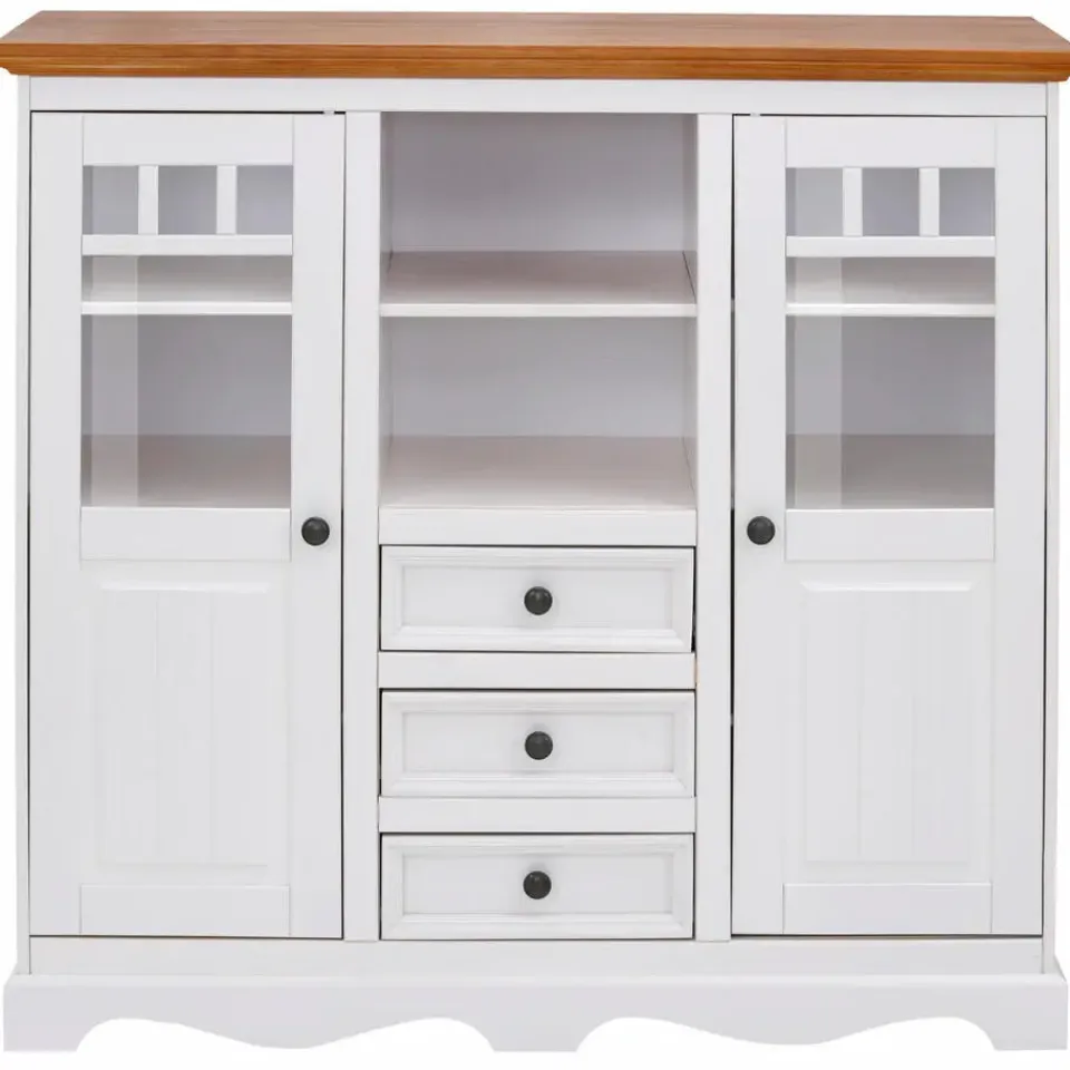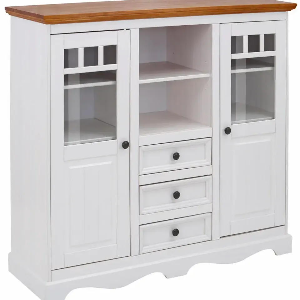 Gemaakt van FSC®-gecertificeerd massief hout, benadrukt het houtuiterlijk de landelijke stijl van de kast. De gebogen elementen en mooie sierlijsten, gecombineerd met metalen handgrepen, zorgen voor een harmonieuze uitstraling. Vazen en verzamelobjecten kunnen worden tentoongesteld achter de glazen inzetstukken van de deuren. Het onderste gedeelte is ideaal voor het opbergen van keukengerei of huishoudtextiel. Bestek en andere kleine voorwerpen vinden hun plaats in de lades. In de open compartimenten komen boeken of fotolijsten van uw dierbaren goed tot hun recht.