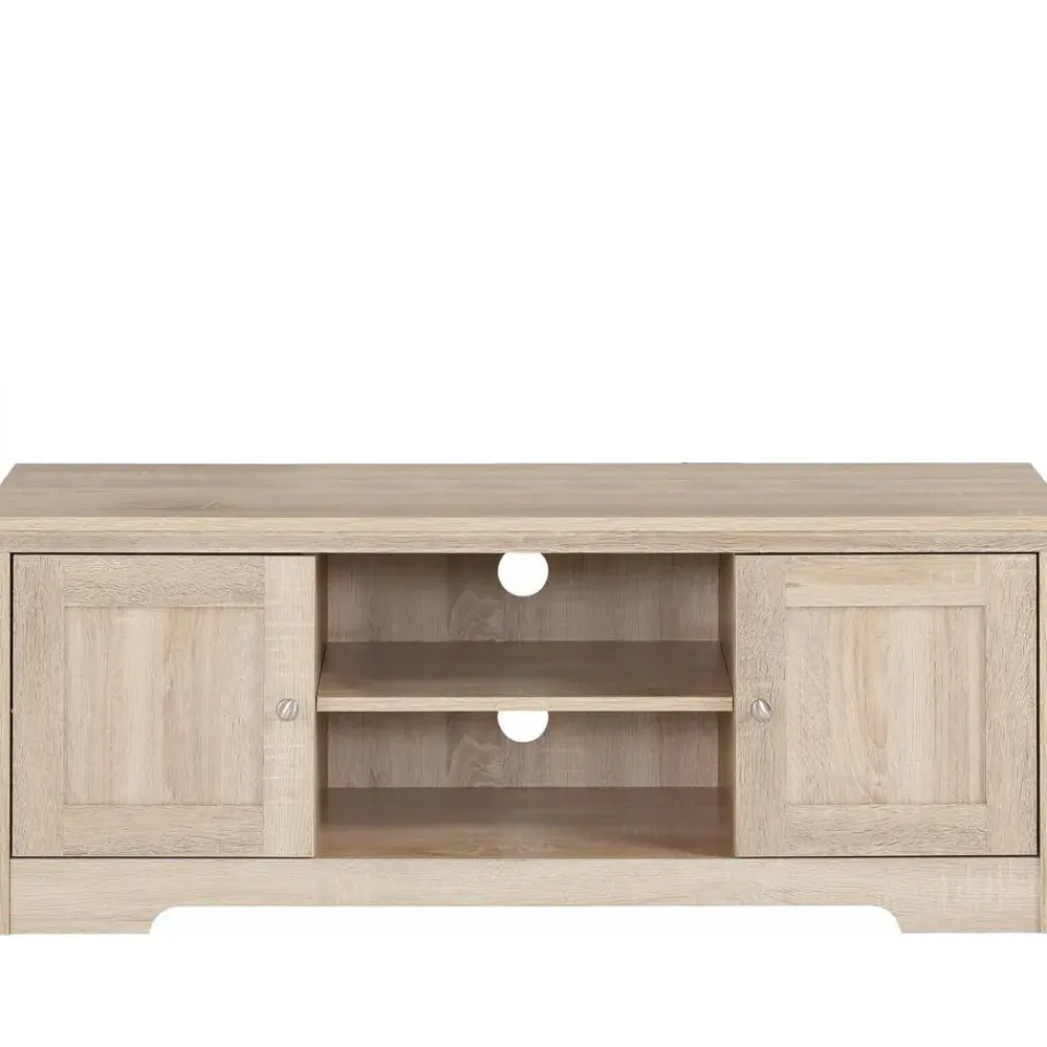 Deze stijlvolle tv-meubel is een prachtige aanvulling op de woonkamer. Het kan perfect worden geïntegreerd, afhankelijk van de kamerspecificatie en meubels. De oppervlakken in eikenlook hebben een nobele uitstraling en zijn gemakkelijk te onderhouden. De metalen handgrepen op de deuren zijn mooi afgestemd op het ontwerp. De kern van de tv-meubel bestaat uit FSC®-gecertificeerd houtmateriaal en is van hoge kwaliteit. Er is voldoende opbergruimte in de verschillend ontworpen compartimenten, waarvan sommige open zijn en andere verborgen achter de houten deuren aan de linker- en rechterkant.