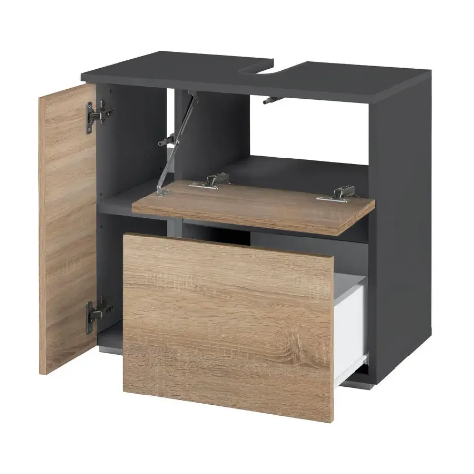 Het badmeubel past perfect in elke badkamer. Achter de deur en klep en in de praktische lade vind je opbergruimte voor al je badkamerbenodigdheden. Dankzij de push-to-open functie kan het meubel zonder handgreep worden geopend. Qua kwaliteit overtuigt het met zijn onderhoudsvriendelijke oppervlak.