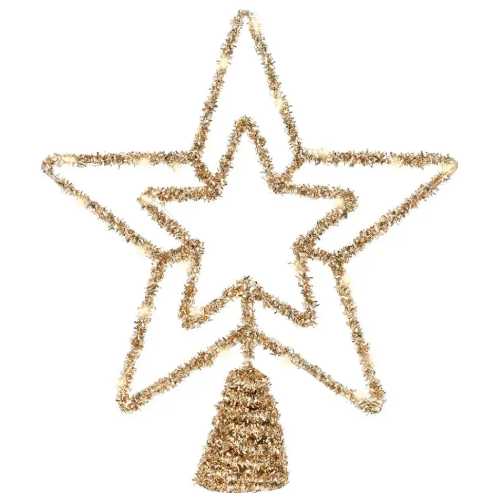 Geef je kerstboom een stralende finishing touch met deze gouden sterpiek met LED-verlichting. De 30 warm witte lampjes zorgen voor een sfeervol en feestelijk effect. Dankzij de batterijvoeding plaats je de ster eenvoudig zonder gedoe met extra bedrading.