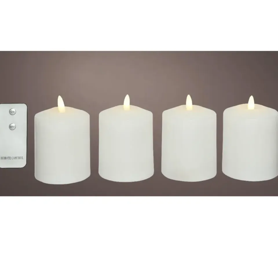 Deze LED kaarsenset bestaat uit 4x stuks witte kaarsen/kerkkaarsen. De kaarsen zijn gemaakt van kunststof materiaal. Ze zijn veilig om te gebruiken, omdat ze geen vlammen of rook produceren. Deze elektronische LED kaarsen zijn ideaal voor gebruik in huis. op feestjes of andere speciale gelegenheden. Formaat kaarsen: D7,5 x H11,5 cm. Voeding per kaars: 3 AA batterijen (niet inbegrepen). Inclusief afstandsbediening. 250 werkuren.