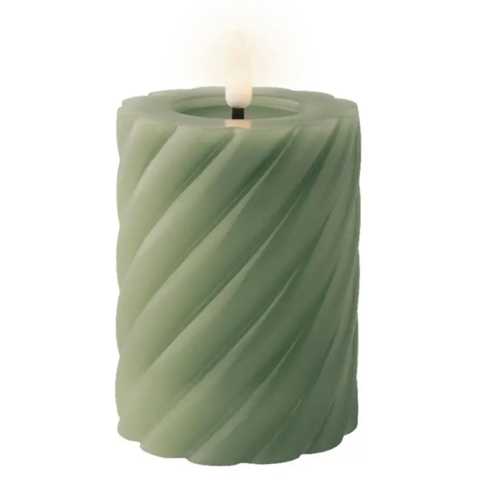 De luxe LED kaars/stompkaars is een elegante en stijlvolle kaars met gedraaide look. Deze LED kaars is groen van kleur en heeft een afmeting van D7,5 x H12,3 cm. De kaars is voorzien van een 6/18 uurs timer, waarmee je de verlichting kunt instellen op een tijd die je wilt. De LED verlichting is energiezuinig en geeft een warm wit, gezellig licht. Geschikt voor binnen. Voeding: 2 AA batterijen (niet inbegrepen. IP20. 250 werkuren.