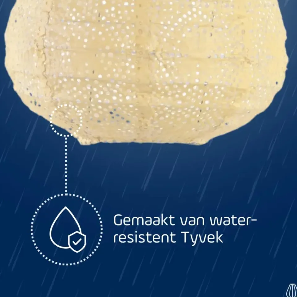 De solar module is uitgevoerd in een bij het Tyvek passende kleur en geeft een warme kleur LED licht. Ons doel om een duurzame LUMIZ LED lampion te ontwikkelen met mooie materialen, heeft ons geleid naar het sterke, weerbestendige en 100% recyclebare Tyvek. Tyvek is een synthetisch materiaal dat bestaat uit vezels van HDPE (hoge-dichtheid-polyetheen): Een zeer hoogwaardig materiaal om u lang te laten genieten van de LUMIZ.