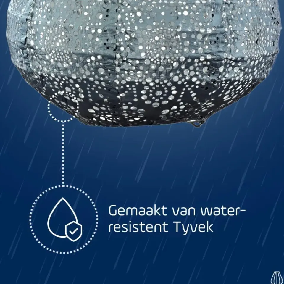 De solar module is uitgevoerd in een bij het Tyvek passende kleur en geeft een warme kleur LED licht. Ons doel om een duurzame LUMIZ LED lampion te ontwikkelen met mooie materialen, heeft ons geleid naar het sterke, weerbestendige en 100% recyclebare Tyvek. Tyvek is een synthetisch materiaal dat bestaat uit vezels van HDPE (hoge-dichtheid-polyetheen): Een zeer hoogwaardig materiaal om u lang te laten genieten van de LUMIZ.