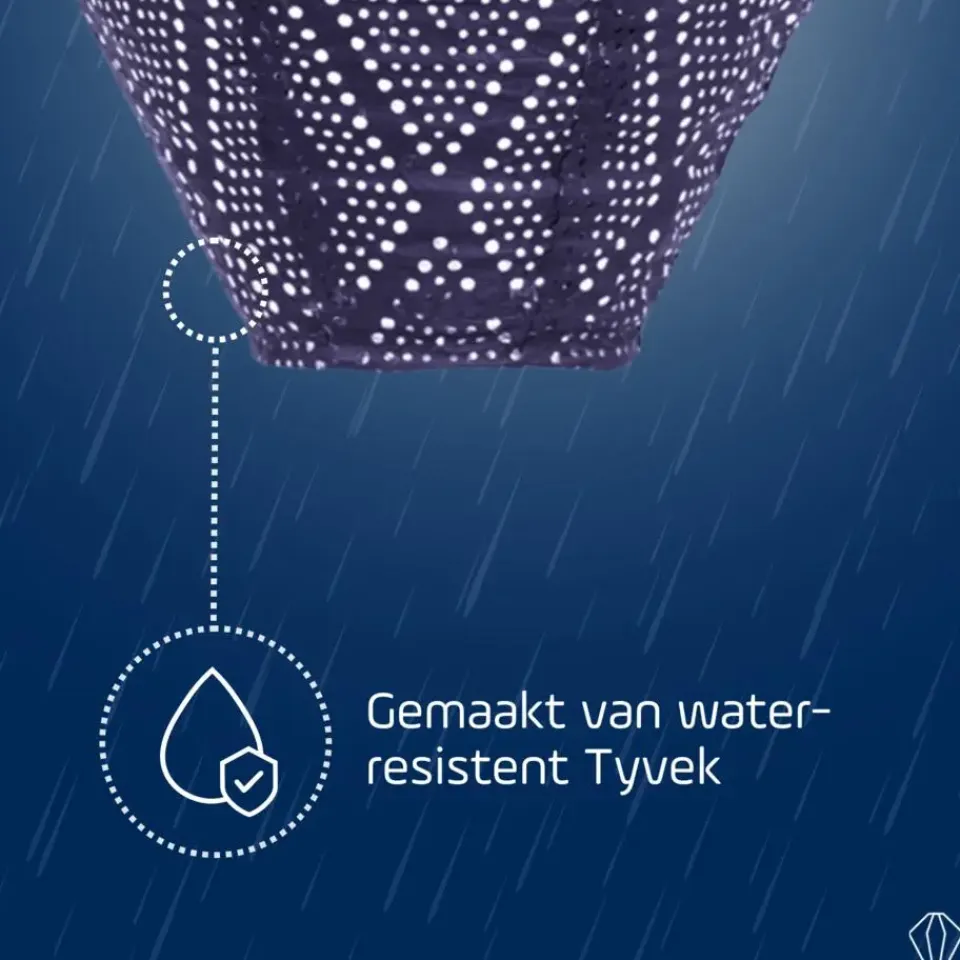 - De Buitenlamp is vervaardigd uit Tyvek, een sterk, weerbestendig en duurzaam 100% recyclebaar materiaal.