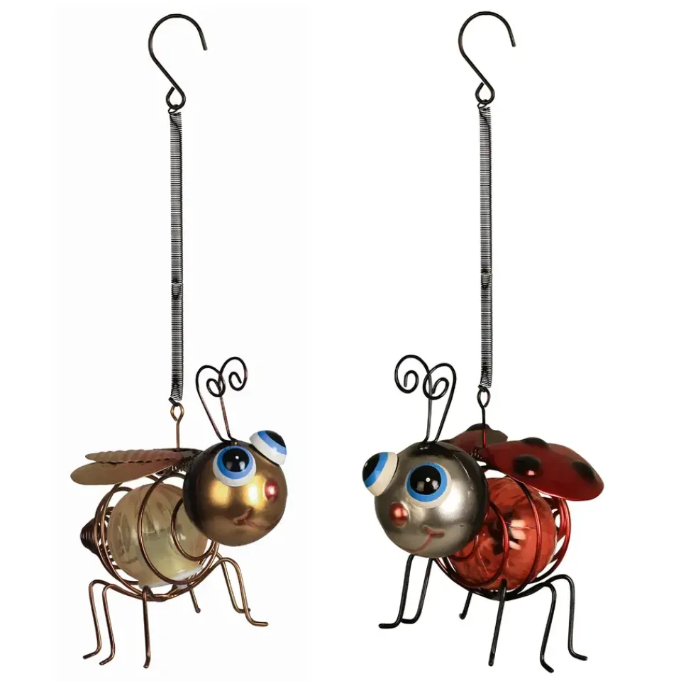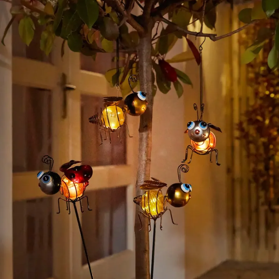 De Bee and LadyBug Hang van Luxform is de gemakkelijkste manier om verlichting in je tuin te plaatsen. Daarnaast geeft de Bij en Lieveheersbeestje door de verschillende verkrijgbare kleuren een vrolijke noot in de tuin! Houd er rekening mee dat het zonnepaneel in kogel naar boven wijst, zodat het solarpaneel voldoende zonlicht op kan vangen. Zodra het ’s avonds donker wordt, licht de kunststof glazen bol van de kleurrijke Bij en Lieveheersbeestje automatisch op. Deze metalen Bij en Lieveheersbeestjes zijn uitgerust met 4 witte LED’s op één streng. De lange veer en de haak maken het heel eenvoudig om de Bij en Lieveheersbeestje hangend in de tuin te plaatsen, bijvoorbeeld boven een tafel, een hek, pergola of aan een rozenboog. De Bij en Lieveheersbeestje kan daarnaast ook op zijn pootjes staan.