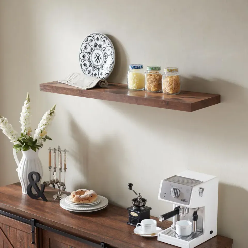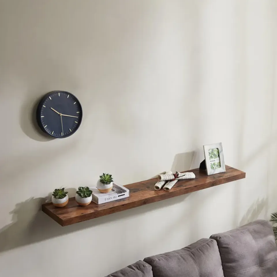 Geef je interieur een warme uitstraling met deze prachtige zwevende wandplank in vintage bruin. Het oogt niet alleen mooi, maar je bespaart ook plaats doordat je geen boekenrek hoeft neer te zetten. Of het nu boeken, plantjes of kaarsen zijn, het kan allemaal met deze zwevende plank.