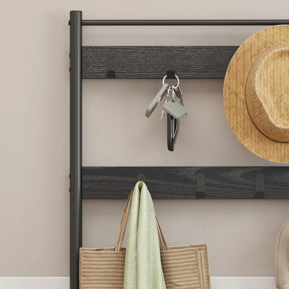Naast de functie van kapstok beschikt dit kledingrek ook over een verzamelruimte voor schoenen. Twee metalen schappen voorzien u ruimte voor zo’n acht paar schoenen. Het gehele schoenenrek draagt tot 80 kg terwijl de haken elk 3 kg draagcapaciteit beschikken. Het spreekt voor zich dat dit type rek uitermate interessant is voor zij die houden van efficiëntie. Jassen en schoenen worden voortaan immers op één en dezelfde plaats verzameld.