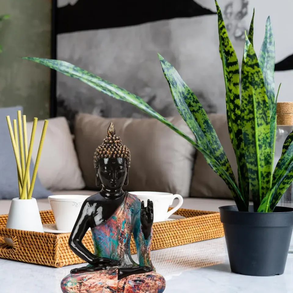 Boeddha decoratie beeld Colorfull, zittend in meditatie houding, voor huis of tuin gemaakt van polyresin kunststeen met gelakte finish zodat pure kunst is, met afmetingen van ongeveer 18 x 31 cm. Geschikt voor binnen en buiten. Kleur: zwart/kleurenmix. Dit boeddha beeld past goed in tuin/interieur en straalt rust en beheersing uit, en is gewoon mooi. U wordt er rustig/relaxed van als u er naar kijkt. Boeddha woon/tuinaccessoires beelden zijn ook zeer geschikt als cadeau.