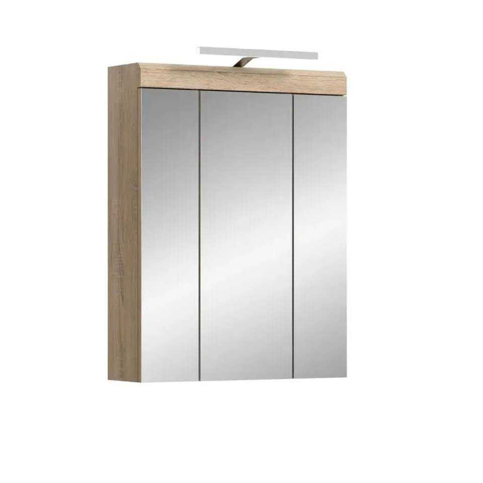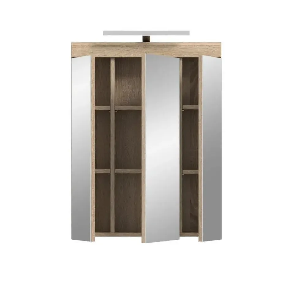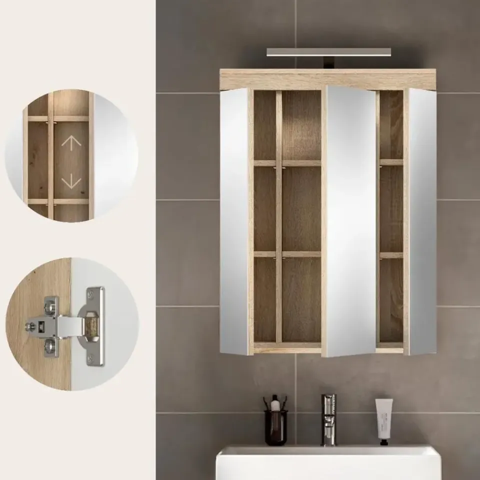 Lambada spiegelkast inclusief verlichting 2 deuren, 3 spiegeldeuren, 3 planken wit hoogglans, eiken decor. Deur omkeerbaar. LED. 6 kWh/1000h. 400 Lumen. 6 Watt. 30.000 uur. Kelvin 5000. EEF: G. LED kan niet worden vervangen. In ons trendy assortiment vindt u de ultieme badkamerspiegelkast met geïntegreerde verlichting, met een stijlvolle rookzilveren afwerking en een hoogglans wit, diepgetrokken oppervlak. Met afmetingen van 60 x 79 x 18 cm is het niet alleen een functionele spiegel, maar ook een stijlvolle accessoire voor uw badkamer. Ervaar de perfecte combinatie van modern design, praktisch gebruik en sfeervolle verlichting met onze trendy spiegelkast.