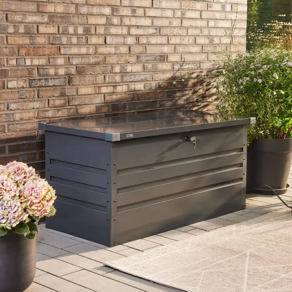 Alles heeft zijn plaats in deze box. Het gegalvaniseerde plaatstaal maakt de box bijzonder duurzaam, praktisch onderhoudsvrij en biedt een uitstekende bescherming tegen corrosie. Er is voldoende ventilatie binnenin, zodat er zich geen vervelende schimmel kan vormen. Het deksel is voorzien van 2 gasdrukcilinders en kan dus moeiteloos geopend worden. De opbergbox kan ook worden afgesloten voor extra veiligheid. Kleine meubelpootjes zorgen voor stabiliteit. Ze beschermen ook het oppervlak en beschermen de opbergbox tegen vocht.