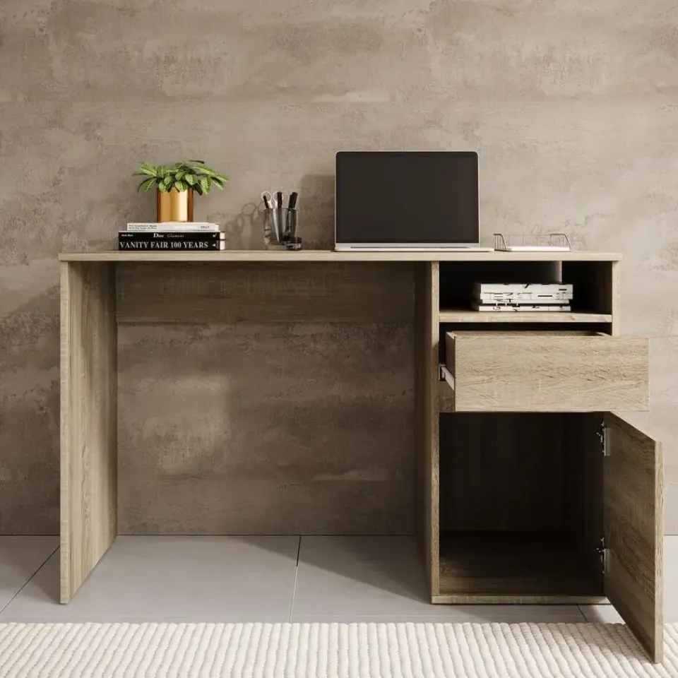 Bureau Babot beschikt over 1 lade, 1 deur en 1 open vak. Achter de deur zit 1 opbergvak. Het meubel is volledig uitgevoerd in de kleur eiken. Dit model heeft een moderne uitstraling. Het meubel wordt ongemonteerd geleverd. Je dient het dus met behulp van de bijgeleverde handleiding zelf in elkaar te zetten.
