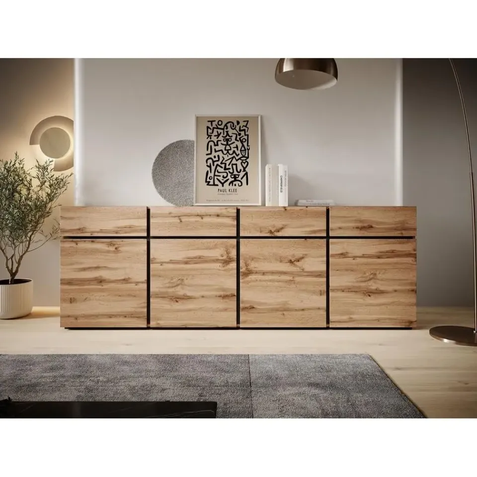 Dressoir Cainan beschikt over 4 lades en 4 deuren met daarachter 8 opbergvakken. De lades en deuren zijn greeploos. De kast is gemaakt in eiken kleur en staat op zwarte, lage pootjes. Het meubel wordt ongemonteerd geleverd. Je dient het dus met behulp van de bijgeleverde handleiding zelf in elkaar te zetten.