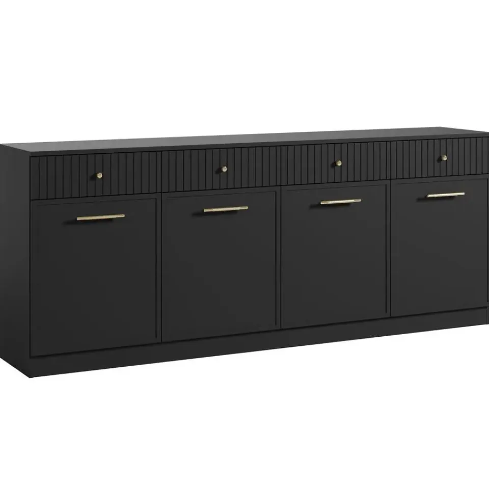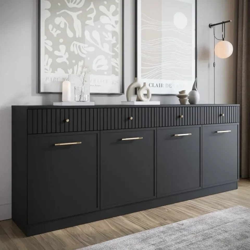 Dressoir Dream is een moderne kast in zwarte kleur. De opbergkast beschikt over 4 deuren waarachter 8 opbergvakken zitten. Boven de deuren zijn nog 4 lades geplaatst. De deuren en lades openen met goudkleurige handgrepen. Het meubel wordt ongemonteerd geleverd. Je dient het dus met behulp van de bijgeleverde handleiding zelf in elkaar te zetten.