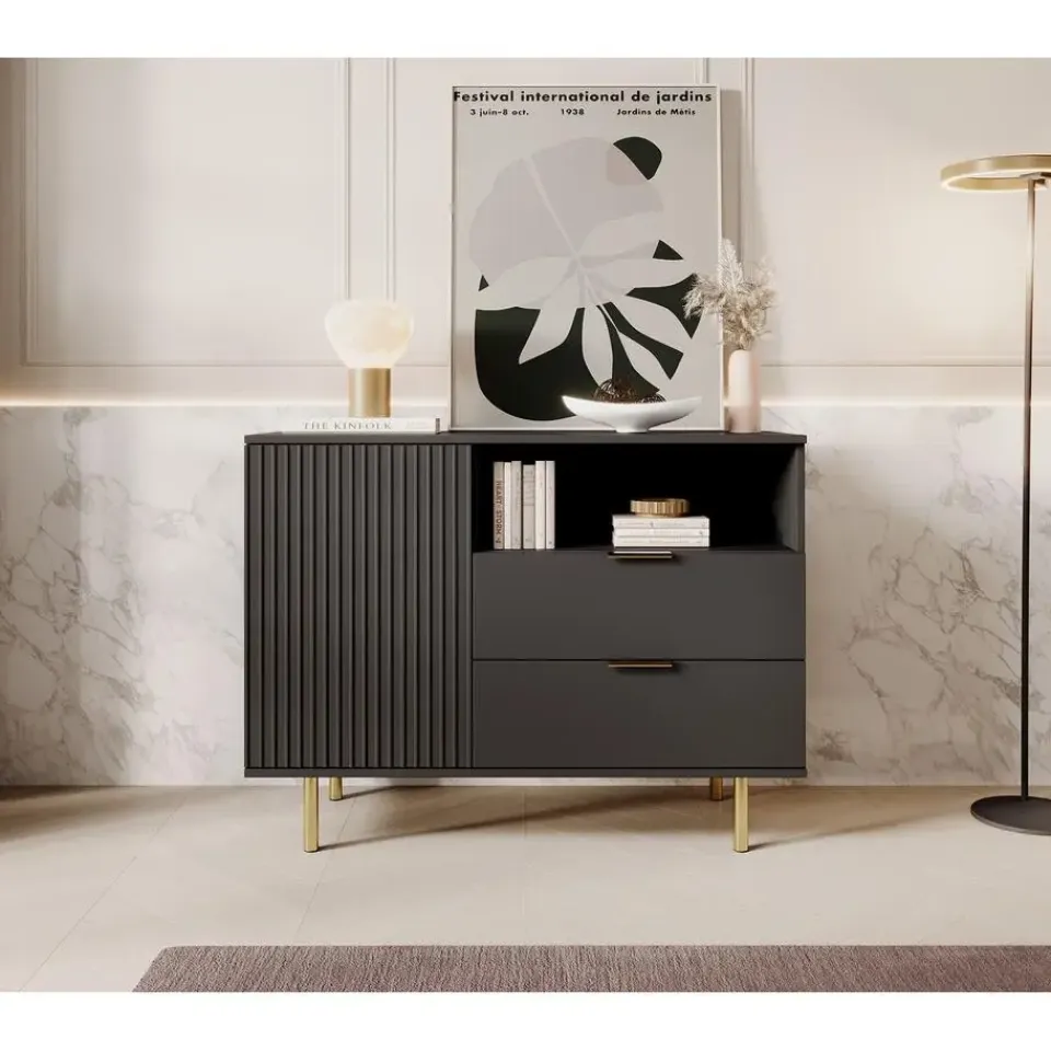 Dressoir Nicola is gemaakt in een mat zwarte kleur. De opbergkast beschikt over 1 deur en 2 lades. Deze openen met goudkleurige handgrepen. Achter de deur zitten 2 opbergvakken. Het dressoir staat op hoge pootjes. Het meubel wordt ongemonteerd geleverd. Je dient het dus met behulp van de bijgeleverde handleiding zelf in elkaar te zetten.