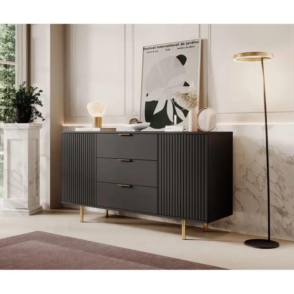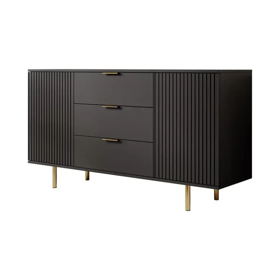 Dressoir Nicola is gemaakt in een mat zwarte kleur. De opbergkast beschikt over 2 deuren en 3 lades. Deze openen met goudkleurige handgrepen. Achter de deuren zitten 4 opbergvakken. Het dressoir staat op hoge pootjes. Het meubel wordt ongemonteerd geleverd. Je dient het dus met behulp van de bijgeleverde handleiding zelf in elkaar te zetten.