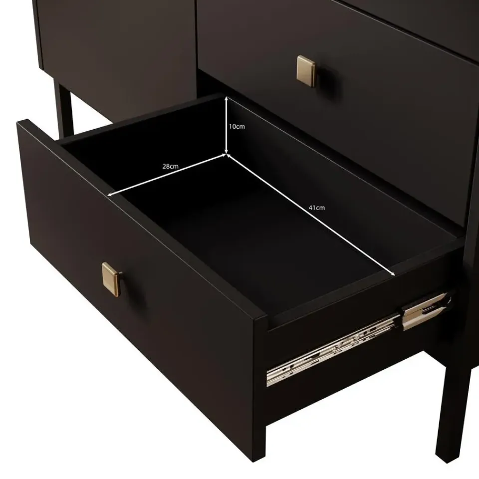 Dressoir Norment beschikt over 4 lades die openen met goudkleurige handgrepen en 1 deur die opent met het push to open systeem. Achter deze deur zitten nog 2 opbergvakken. Het meubel is uitgevoerd in de kleur zwart en staat op metalen poten. Het meubel wordt ongemonteerd geleverd. Je dient het dus met behulp van de bijgeleverde handleiding zelf in elkaar te zetten.