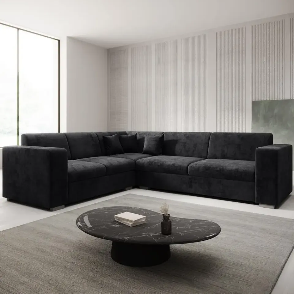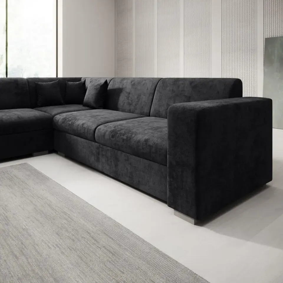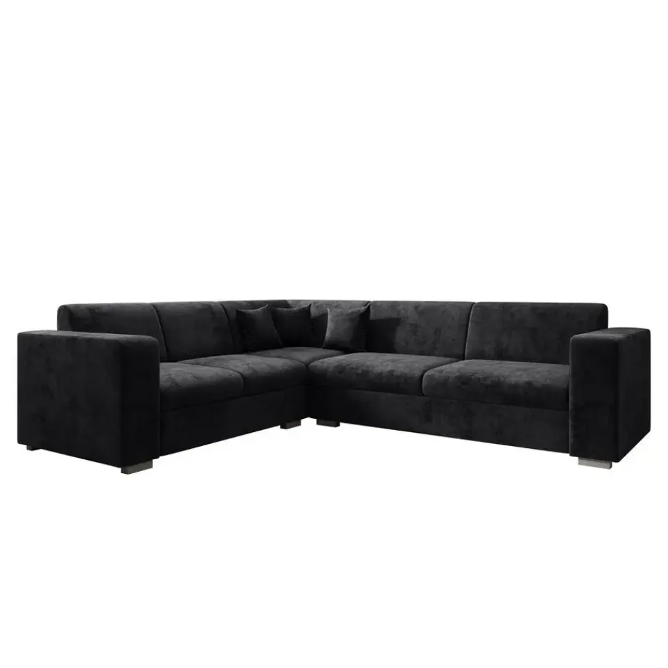 Hoekbank Santana is gemaakt van velvet in zwarte kleur. De Santana is een bank in L-vorm. Staat op lage, zilvergrijze poten. De Santana heeft vaste zit- en rugkussens. Wordt geleverd inclusief 3 sierkussens. Het meubel wordt ongemonteerd geleverd. Je dient het dus met behulp van de bijgeleverde handleiding zelf in elkaar te zetten.