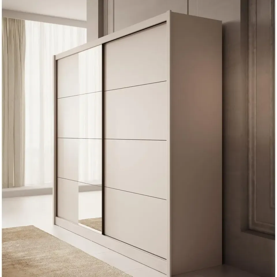 Kledingkast Azul beschikt over 2 schuifdeuren waarvan de linker voorzien is van een spiegel. De binnenkant bestaat uit 10 opbergvakken en 2 kledingroedes. De kast is uitgevoerd in een beige kleur en heeft een moderne stijl. Het meubel wordt ongemonteerd geleverd. Je dient het dus met behulp van de bijgeleverde handleiding zelf in elkaar te zetten.