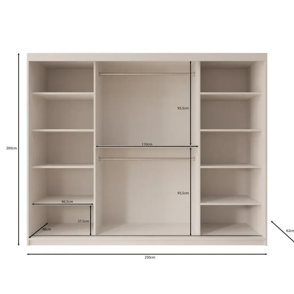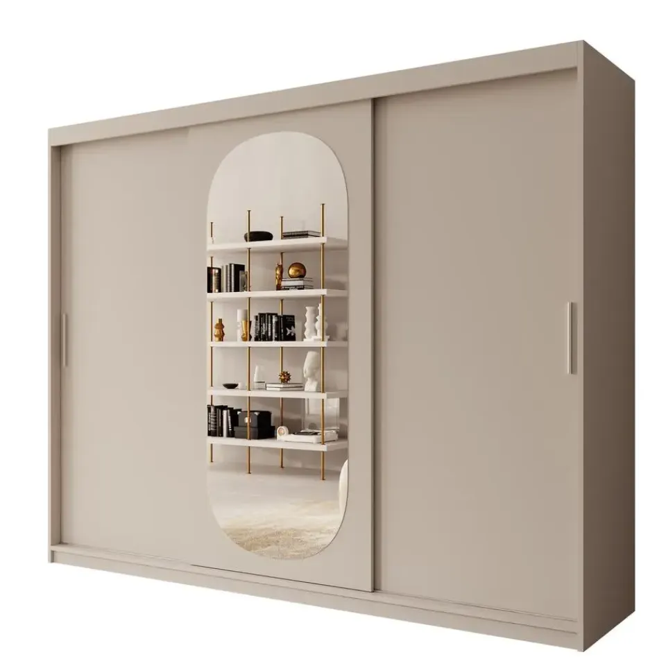 Kledingkast Bodhi beschikt over 3 schuifdeuren die openen met zilverkleurige handgrepen. De linkerdeur is voorzien van een ovale spiegel. De binnenkant bestaat uit 10 opbergvakken en 2 kledingroedes. De kast is uitgevoerd in beige kleur. Het meubel wordt ongemonteerd geleverd. Je dient het dus met behulp van de bijgeleverde handleiding zelf in elkaar te zetten.