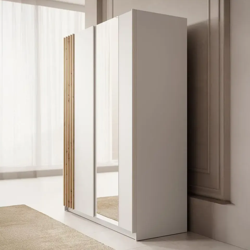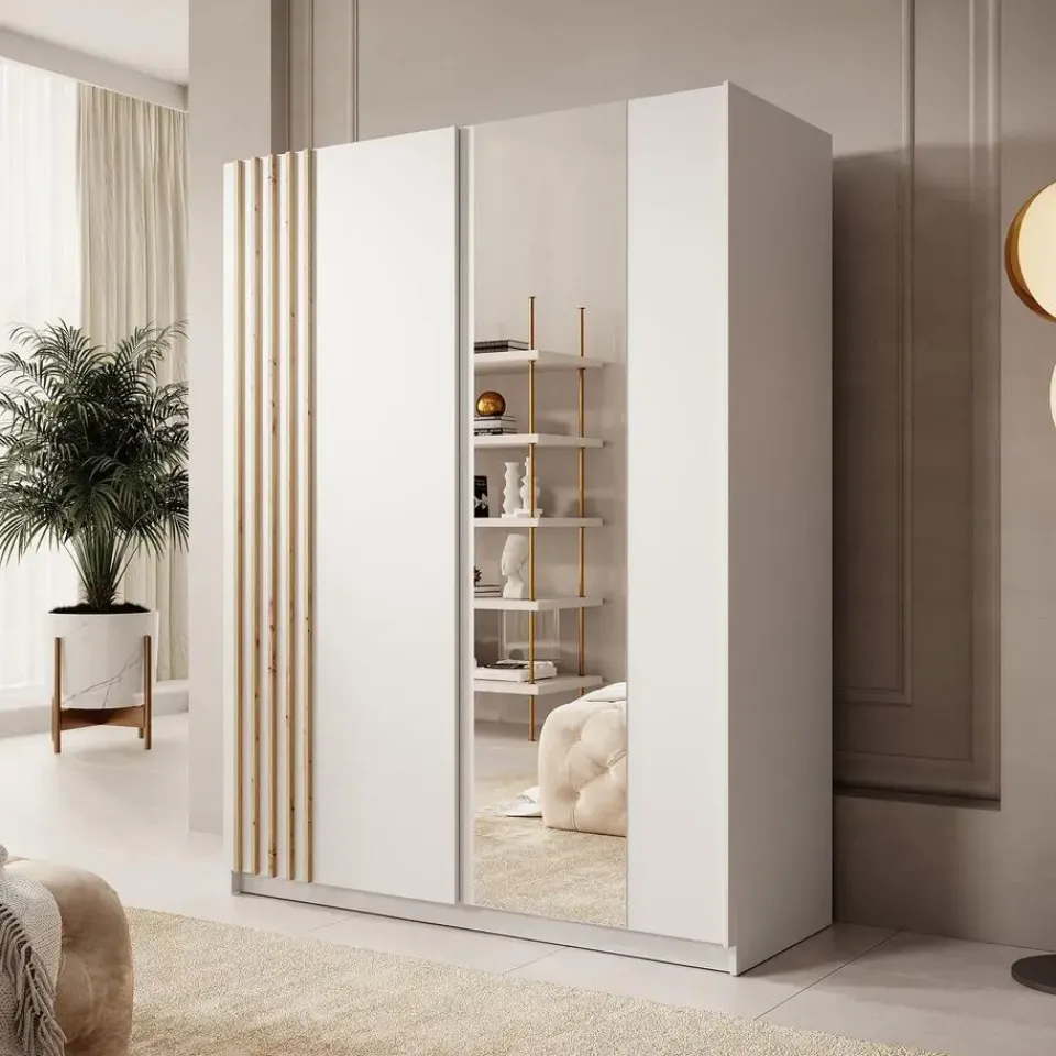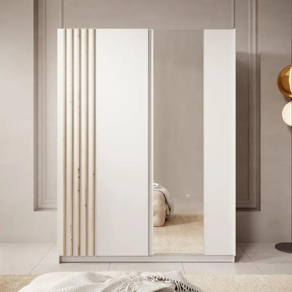 Kledingkast Boets is voorzien van 2 schuifdeuren. Eén deur is gedeeltelijk voorzien van een handige spiegel, de andere deur beschikt over eiken latjes. De binnenkant bestaat uit 5 opbergvakken en een kledingroede. Het meubel wordt ongemonteerd geleverd. Je dient het dus met behulp van de bijgeleverde handleiding zelf in elkaar te zetten.