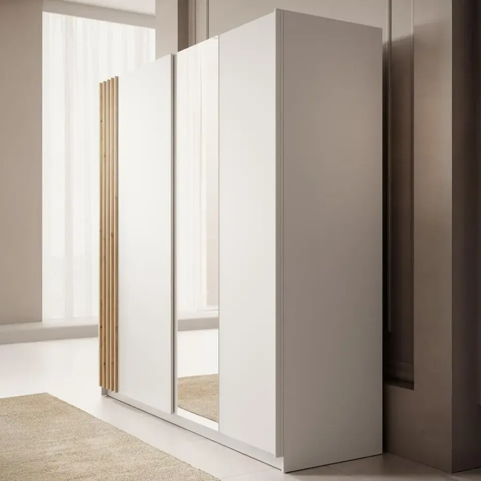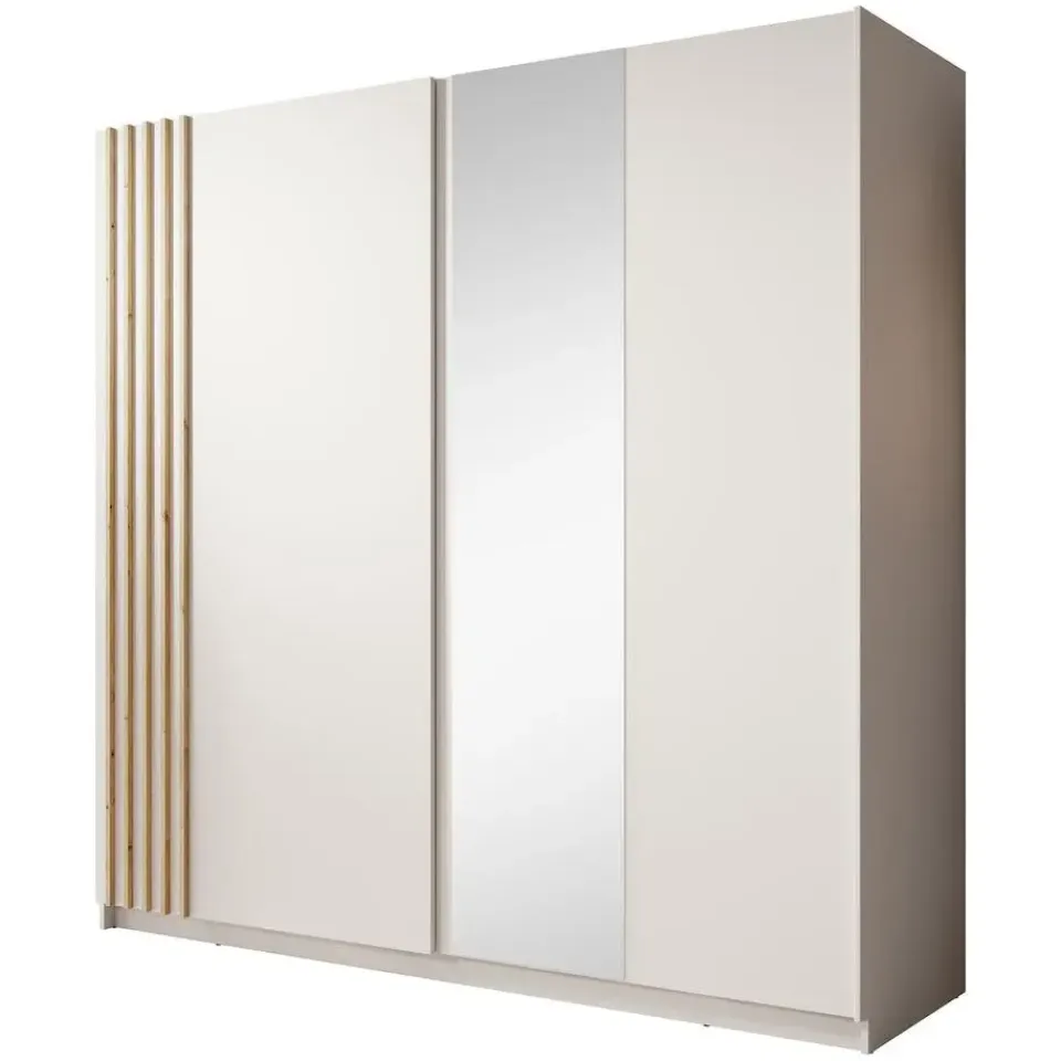 Kledingkast Boets is voorzien van 2 schuifdeuren. Eén deur is gedeeltelijk voorzien van een handige spiegel, de andere deur beschikt over eiken latjes. De binnenkant bestaat uit 5 opbergvakken en een kledingroede. Het meubel wordt ongemonteerd geleverd. Je dient het dus met behulp van de bijgeleverde handleiding zelf in elkaar te zetten.