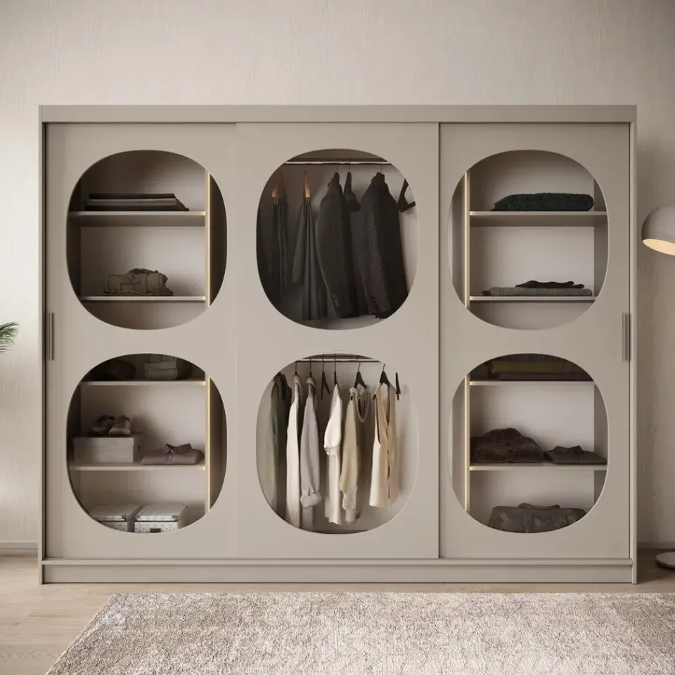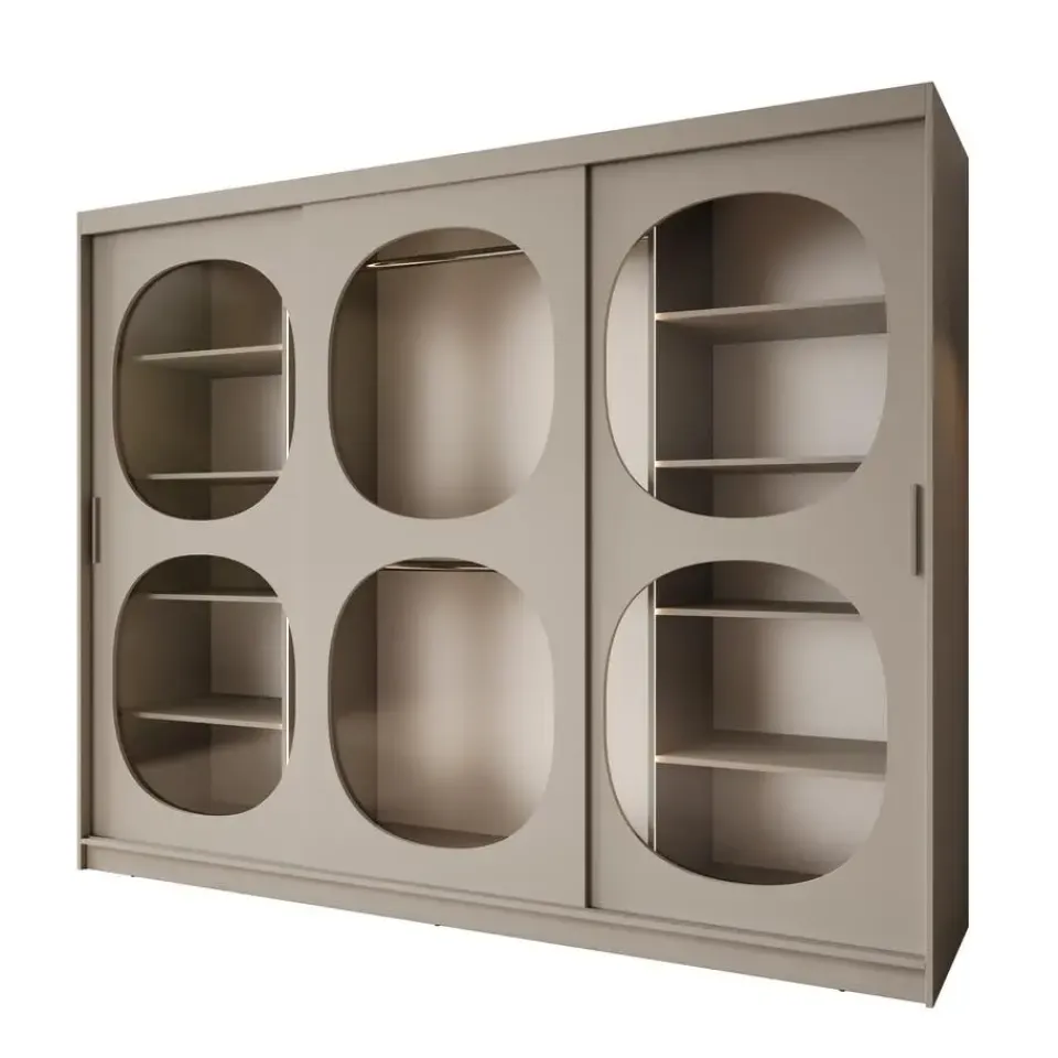 Kledingkast Bravanti beschikt over 3 schuifdeuren die openen met zilverkleurige handgrepen. Deze deuren zijn voorzien van rookglas in ronde vorm. De binnenkant bestaat uit 2 kledingroedes en 10 opbergvakken. Wordt geleverd inclusief LED-verlichting. Het meubel wordt ongemonteerd geleverd. Je dient het dus met behulp van de bijgeleverde handleiding zelf in elkaar te zetten.