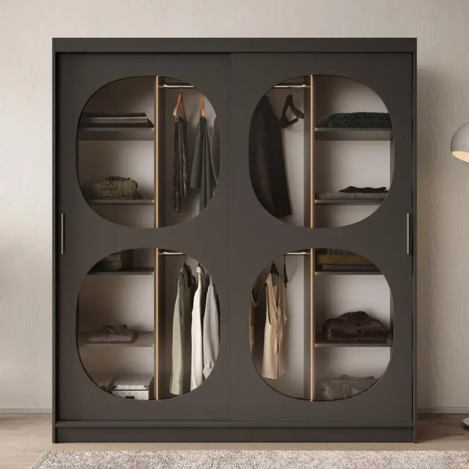 Kledingkast Bravanti beschikt over 2 schuifdeuren die openen met zilverkleurige handgrepen. Deze deuren zijn voorzien van rookglas in ronde vorm. De binnenkant bestaat uit 2 kledingroedes en 10 opbergvakken. Wordt geleverd inclusief LED-verlichting. Het meubel wordt ongemonteerd geleverd. Je dient het dus met behulp van de bijgeleverde handleiding zelf in elkaar te zetten.