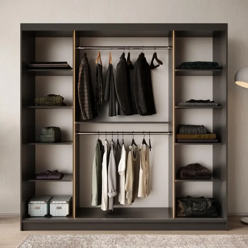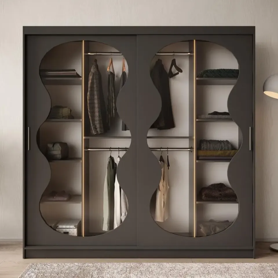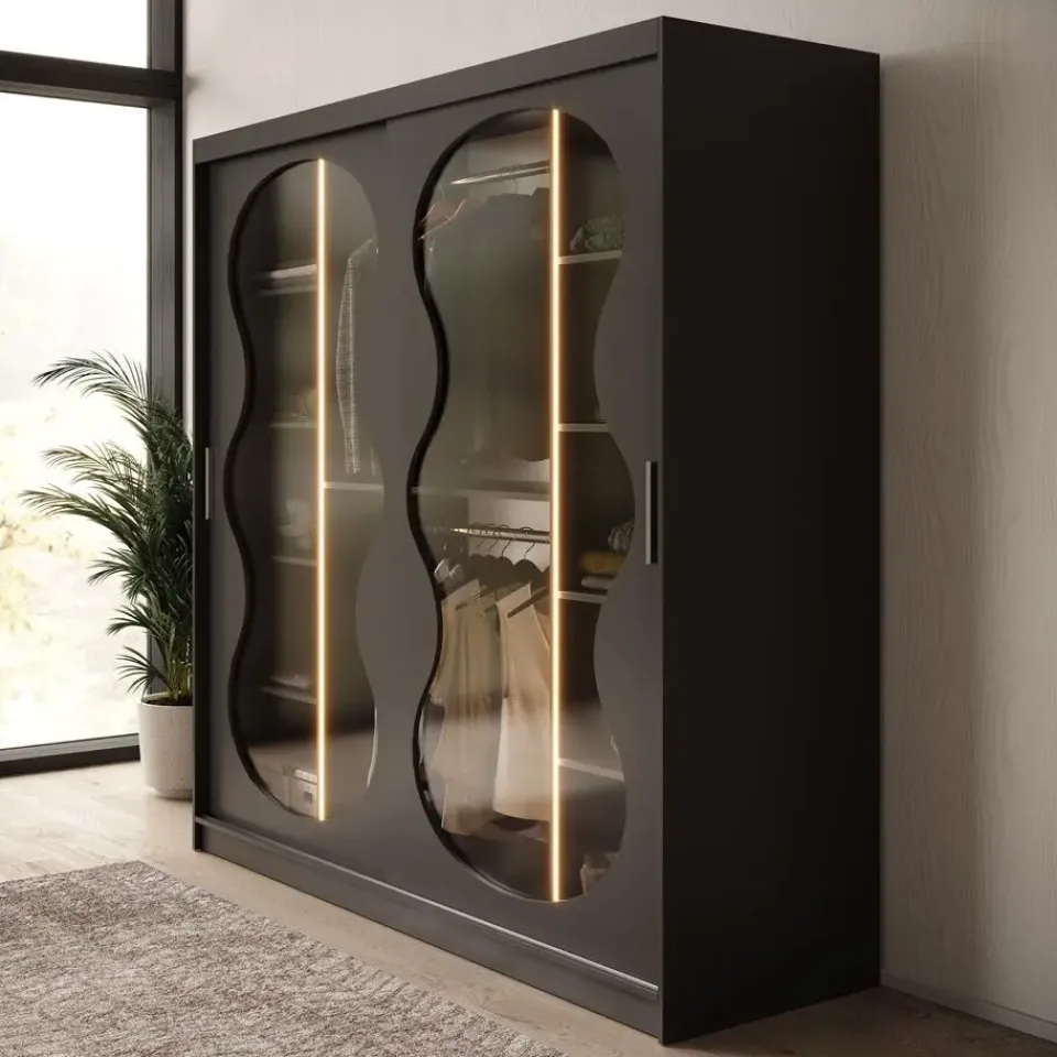 Kledingkast Bunaro beschikt over 2 schuifdeuren die openen met zilverkleurige handgrepen. Deze deuren zijn voorzien van rookglas in golvende vorm. De binnenkant bestaat uit 2 kledingroedes en 10 opbergvakken. Wordt geleverd inclusief LED-verlichting. Het meubel wordt ongemonteerd geleverd. Je dient het dus met behulp van de bijgeleverde handleiding zelf in elkaar te zetten.