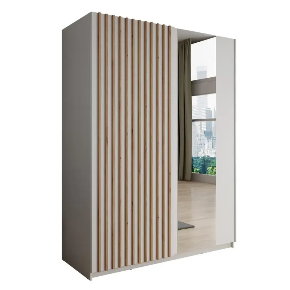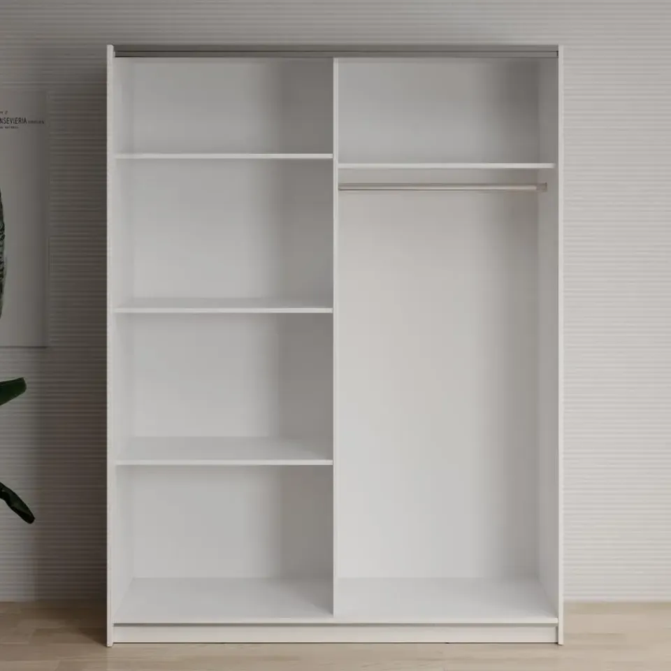 Kledingkast Deliryon beschikt over 2 schuifdeuren. Dankzij het schuifdeursysteem bespaar je ruimte in de kamer. De rechterdeur heeft een spiegel. De binnenkant bestaat uit 5 opbergvakken en 1 kledingroede. De kast is uitgevoerd in de kleur wit. Het meubel wordt ongemonteerd geleverd. Je dient het dus met behulp van de bijgeleverde handleiding zelf in elkaar te zetten.