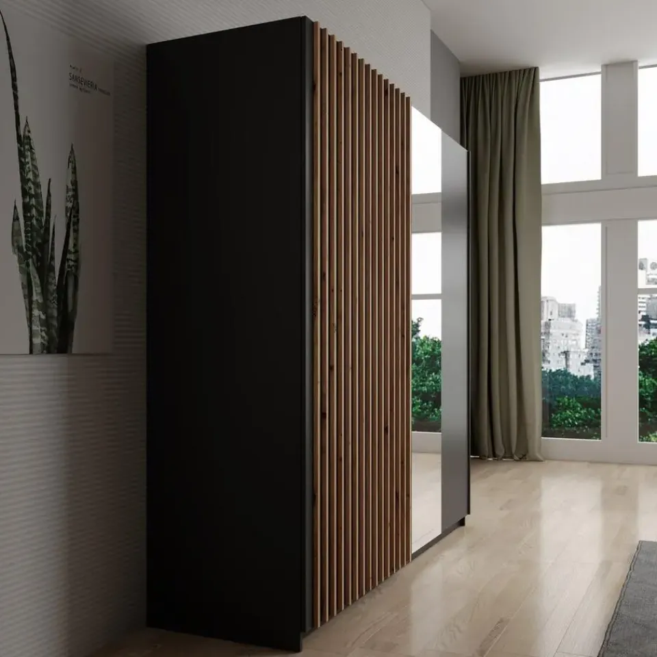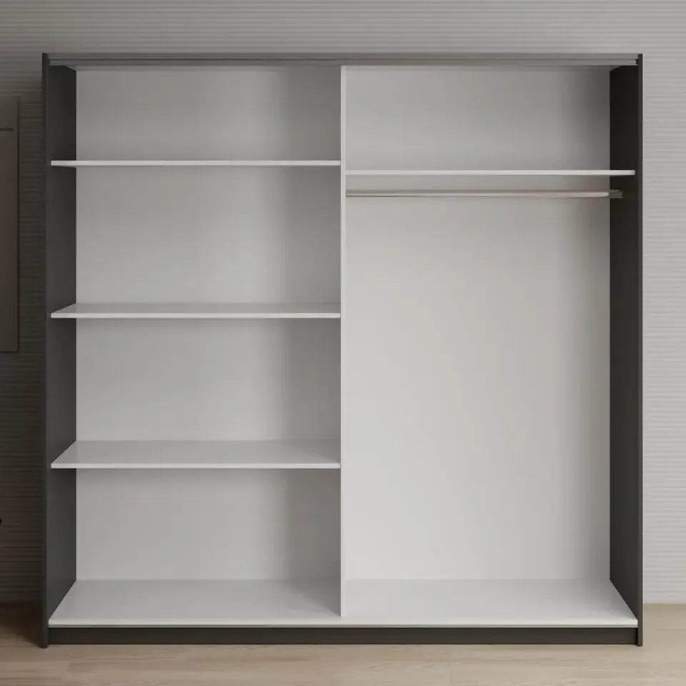 Kledingkast Deliryon beschikt over 2 schuifdeuren. Dankzij het schuifdeursysteem bespaar je ruimte in de kamer. De rechterdeur heeft een spiegel. De binnenkant bestaat uit 5 opbergvakken en 1 kledingroede. De kast is uitgevoerd in de kleur zwart. Het meubel wordt ongemonteerd geleverd. Je dient het dus met behulp van de bijgeleverde handleiding zelf in elkaar te zetten.
