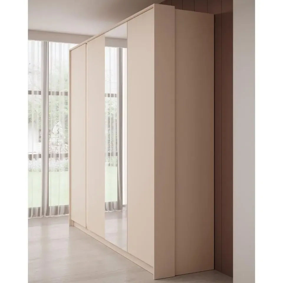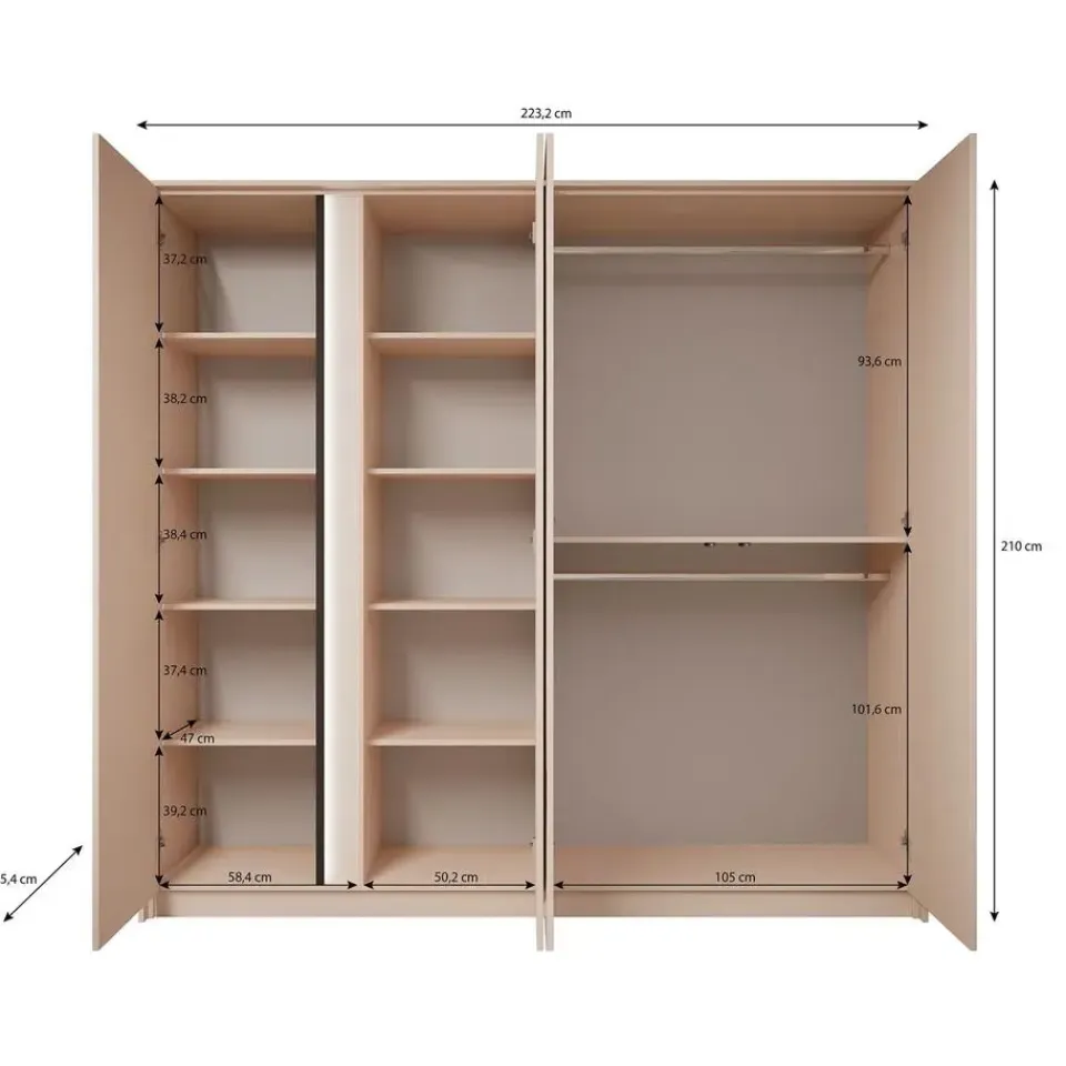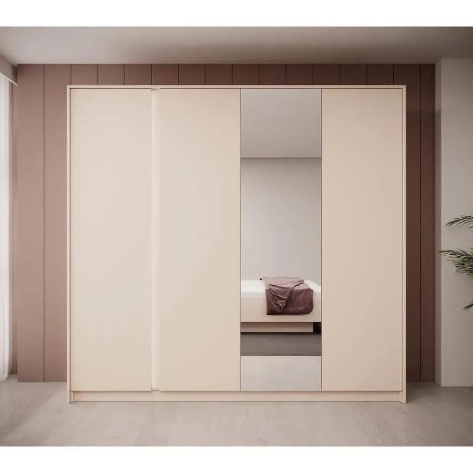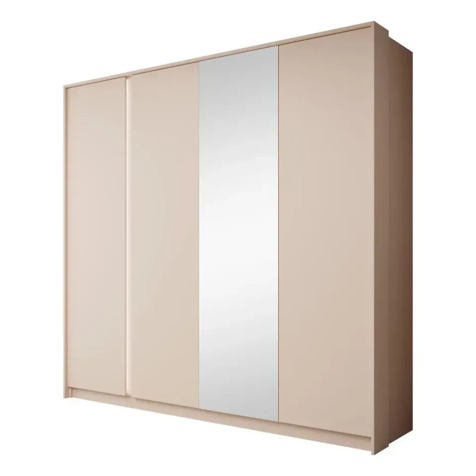 Kledingkast Desert is gemaakt in een beige kleur. Beschikt over 4 scharnierdeuren. Op een deur zit een grote spiegel. De binnenkant bestaat uit 2 kledingroedes en 10 opbergvakken. Het meubel wordt ongemonteerd geleverd. Je dient het dus met behulp van de bijgeleverde handleiding zelf in elkaar te zetten.