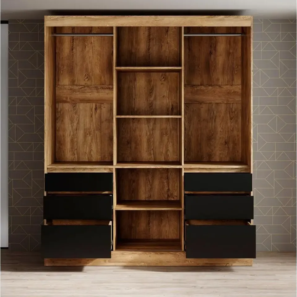 Kledingkast Henry beschikt over 3 schuifdeuren waarvan de middelste voorzien is van een spiegel. De binnenkant bestaat uit 2 kledingroedes en 5 opbergvakken. Ten slotte zijn er nog 6 lades te vinden. Het meubel wordt ongemonteerd geleverd. Je dient het dus met behulp van de bijgeleverde handleiding zelf in elkaar te zetten.