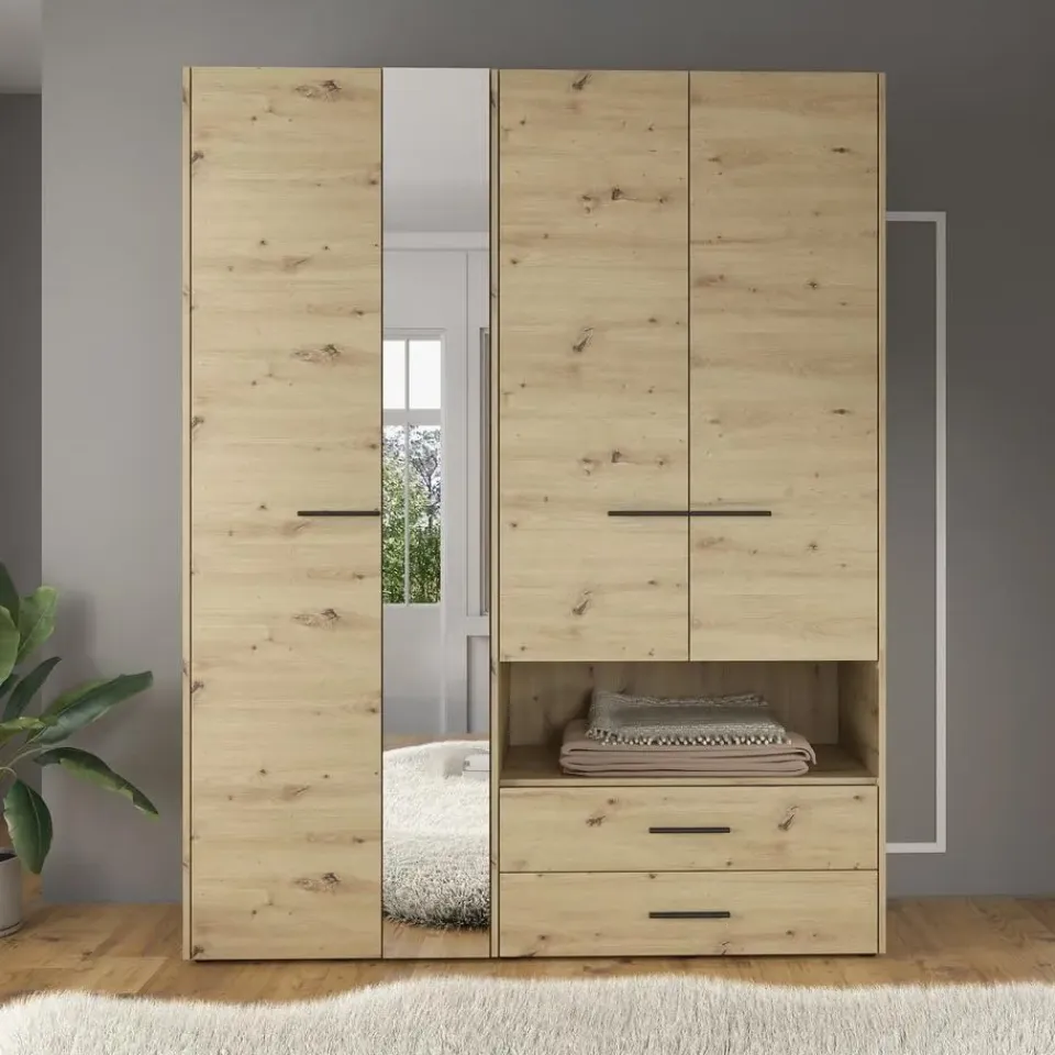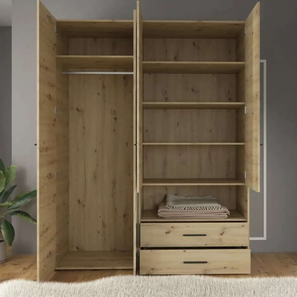 Kledingkast Laura beschikt over 4 scharnierdeuren. Op één deur is een handige spiegel geplaatst. De binnenkant bestaat uit 1 kledingroede en 6 open vakken. Ten slotte heeft het meubel ook nog 2 lades. Het meubel wordt ongemonteerd geleverd. Je dient het dus met behulp van de bijgeleverde handleiding zelf in elkaar te zetten.
