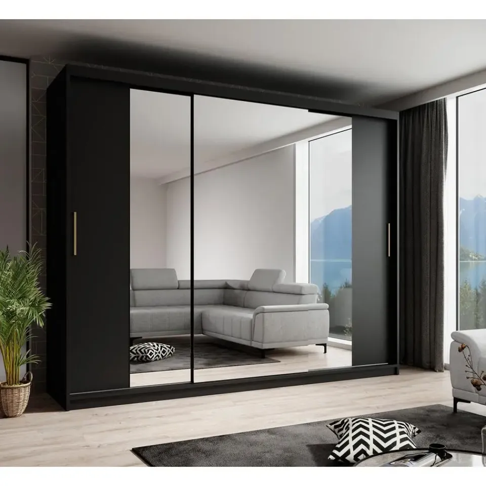 Kledingkast Mandalin beschikt over 3 schuifdeuren die te openen zijn met goudkleurige handgrepen. Op alle deuren zit een spiegel. De binnenkant bestaat uit 2 kledingroedes en 10 opbergvakken. Het meubel wordt ongemonteerd geleverd. Je dient het dus met behulp van de bijgeleverde handleiding zelf in elkaar te zetten.