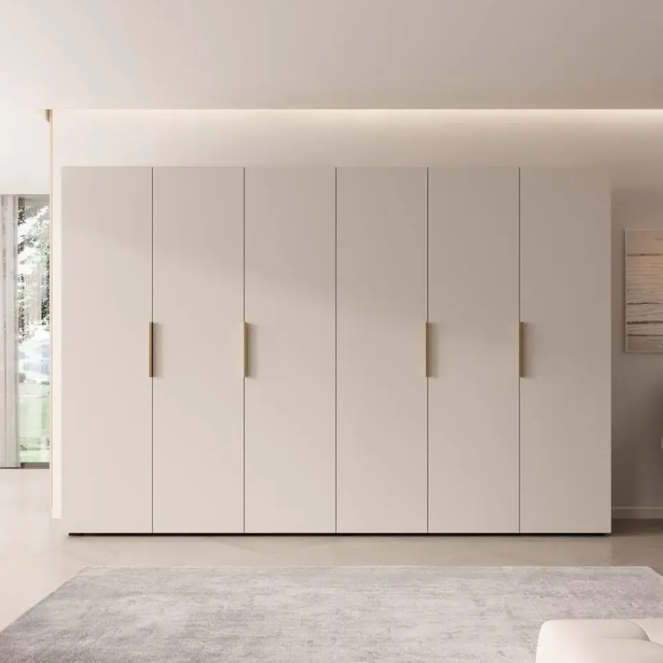 Kledingkast Marquesa beschikt over 6 scharnierdeuren die openen met goudkleurige handgrepen. De kast bestaat uit 2 elementen van 150 cm. De binnenkant bestaat uit 4 opbergvakken en 4 kledingroedes. De kast is uitgevoerd in de kleur beige. Het meubel wordt ongemonteerd geleverd. Je dient het dus met behulp van de bijgeleverde handleiding zelf in elkaar te zetten.