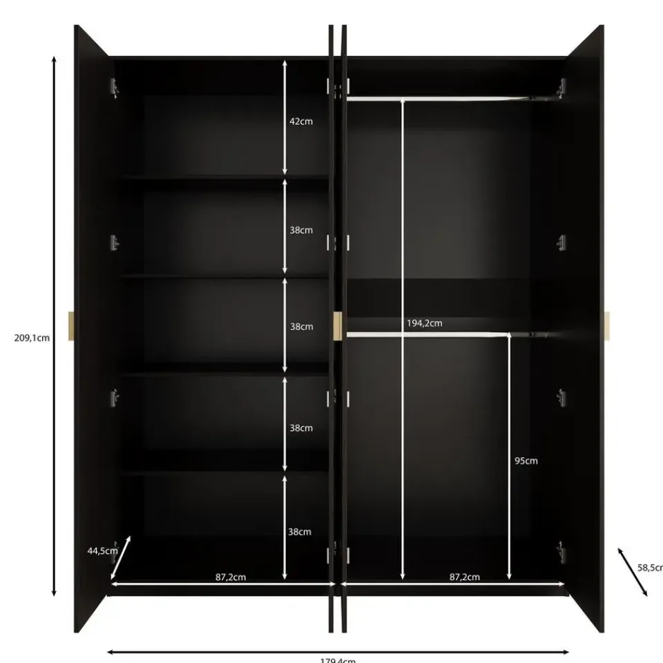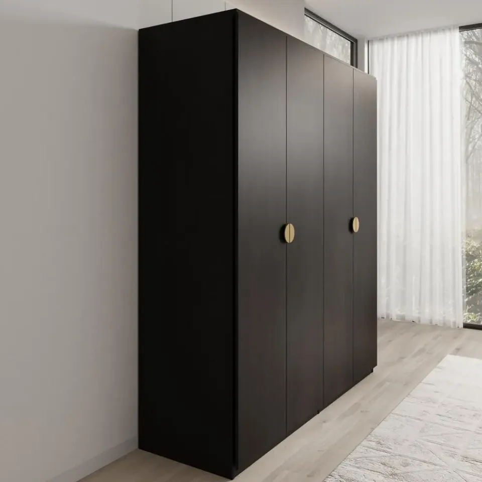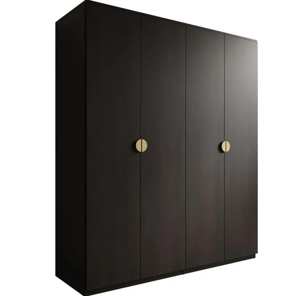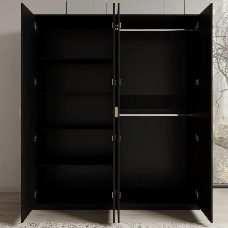 Kledingkast Monor beschikt over 4 scharnierdeuren die openen met goudkleurige handgrepen. De binnenkant bestaat uit 5 opbergvakken en 2 kledingroedes. De kast is uitgevoerd in zwart eiken kleur. Het meubel wordt ongemonteerd geleverd. Je dient het dus met behulp van de bijgeleverde handleiding zelf in elkaar te zetten.