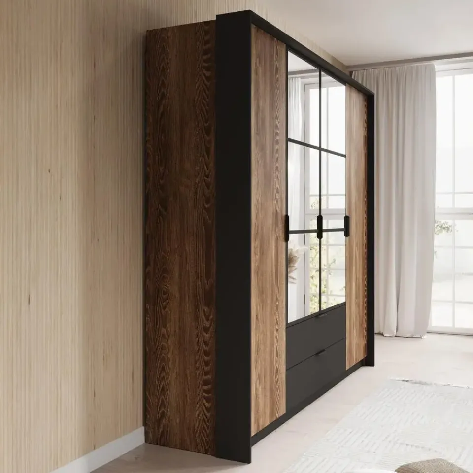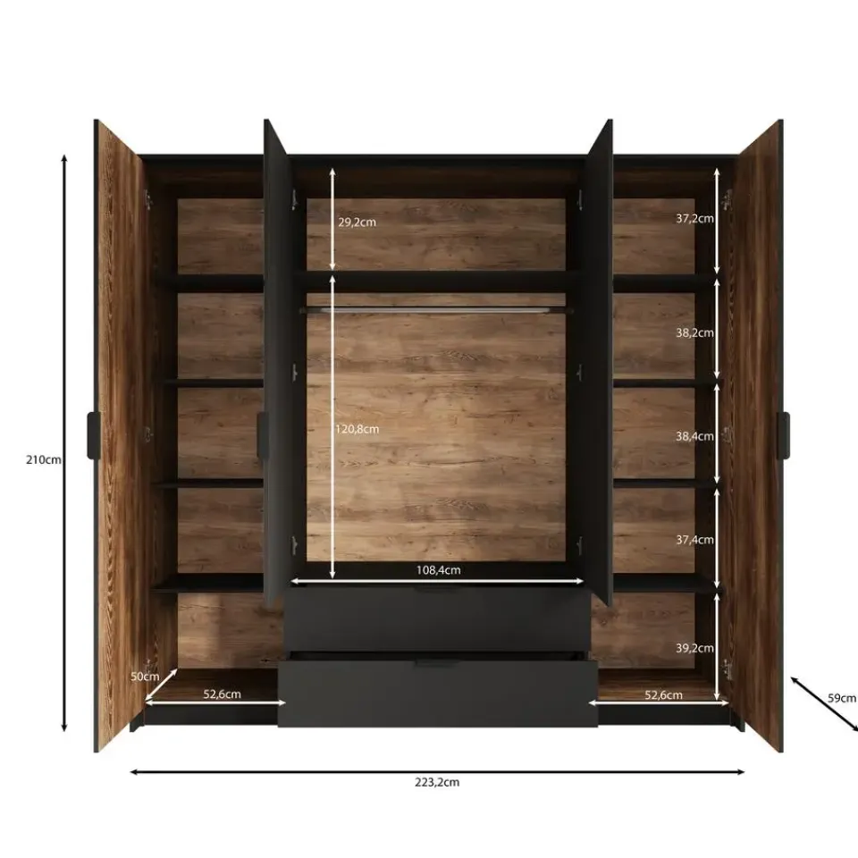 Kledingkast Mulvey is gemaakt in een eiken kleur. Beschikt over 4 scharnierdeuren die openen met zwarte handgrepen. In de binnenkant bevinden zich 11 opbergvakken, twee lades en een kledingroede. De kast beschikt over LED-verlichting. Het meubel wordt ongemonteerd geleverd. Je dient het dus met behulp van de bijgeleverde handleiding zelf in elkaar te zetten.