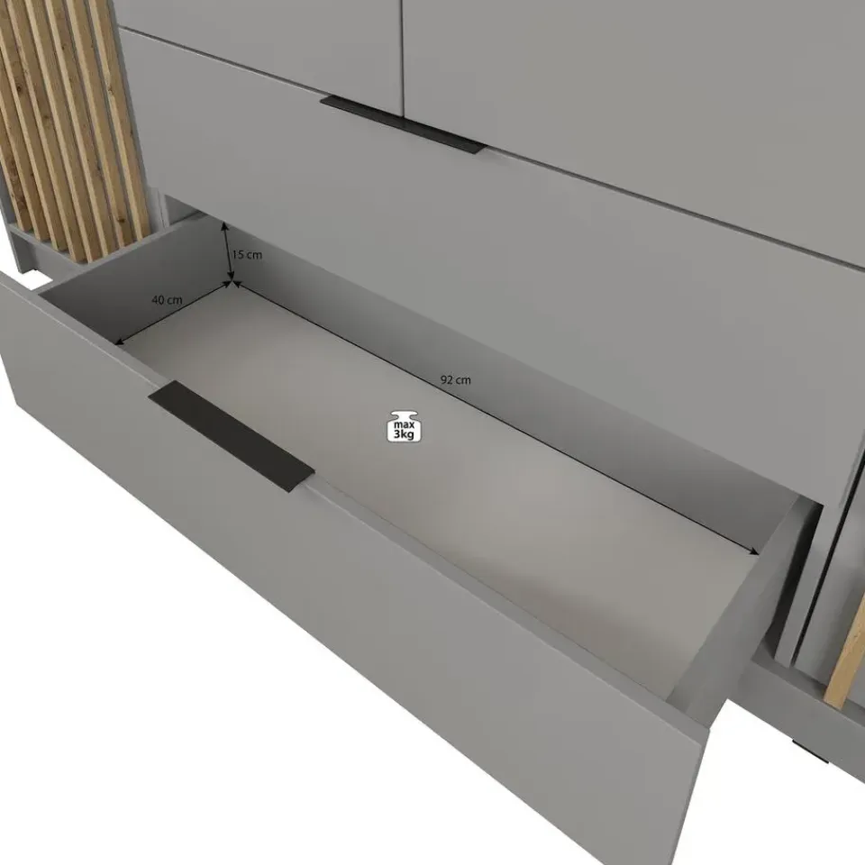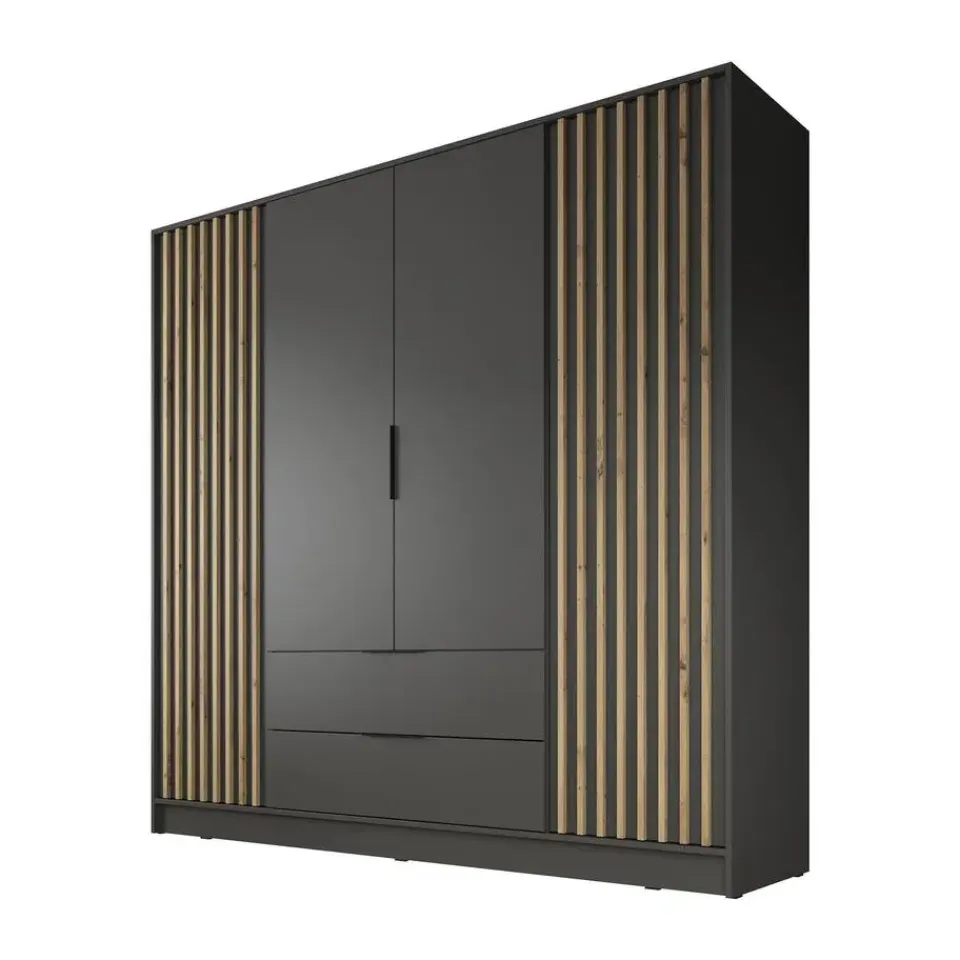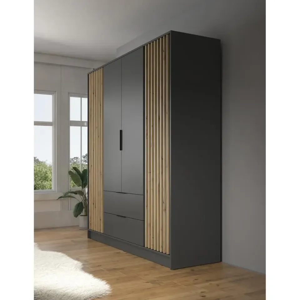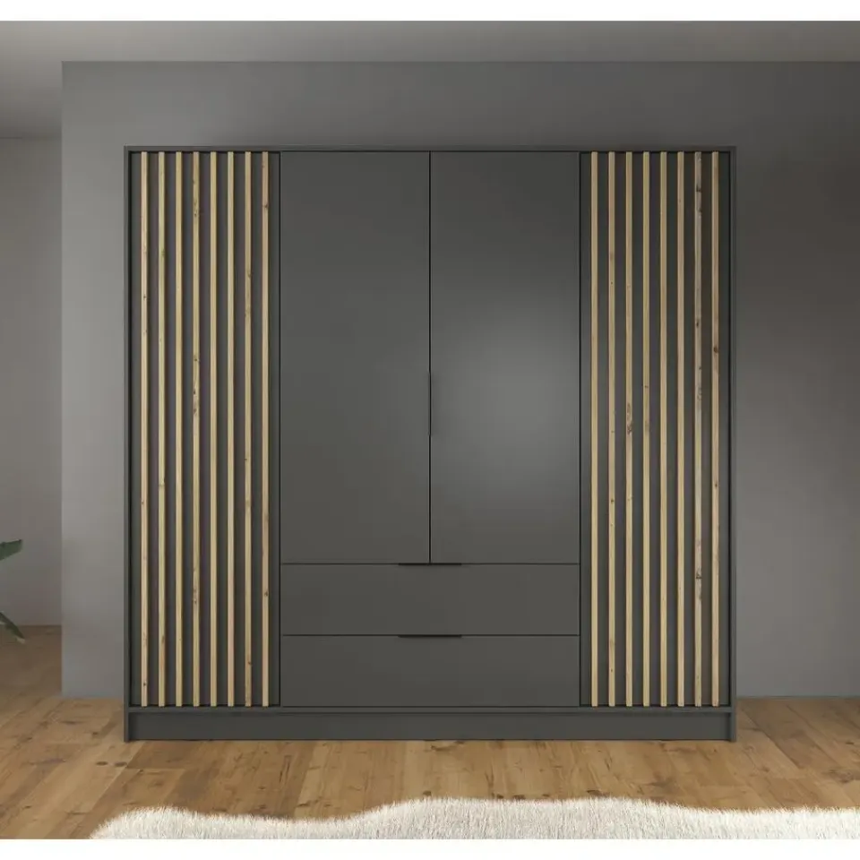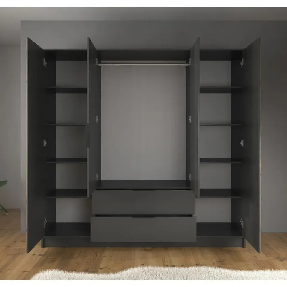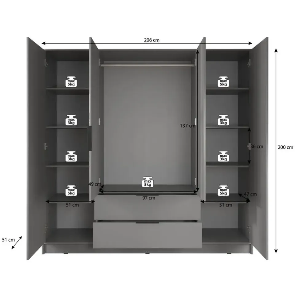 Kledingkast Nairobi beschikt over 4 deuren. De binnenkant bestaat uit een kledingroede en 10 opbergvakken. Ook heeft het meubel nog 2 handige lades. Het meubel wordt ongemonteerd geleverd. Je dient het dus met behulp van de bijgeleverde handleiding zelf in elkaar te zetten.