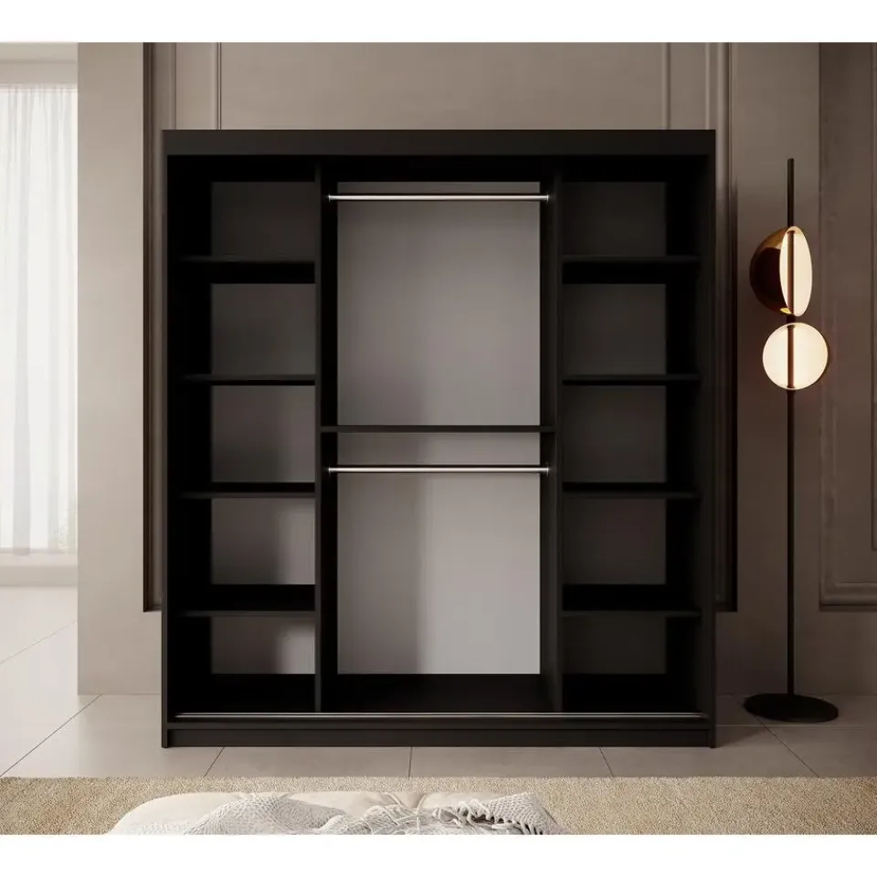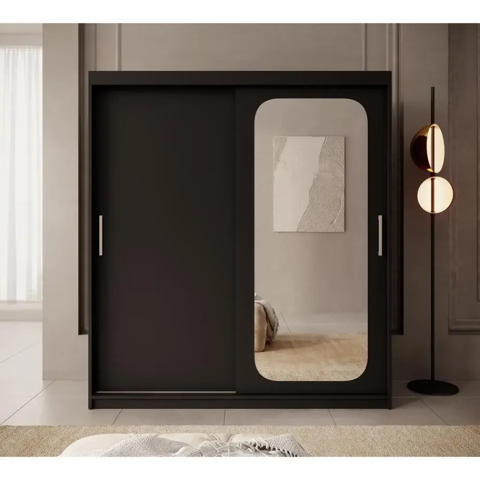Kledingkast Pete is voorzien van 2 schuifdeuren welke openen met zilverkleurige handgrepen. De binnenkant bestaat uit 10 opbergvakken en 2 kledingroedes. De rechterdeur heeft een handige spiegel. De garderobekast is uitgevoerd in een moderne stijl. Het meubel wordt ongemonteerd geleverd. Je dient het dus met behulp van de bijgeleverde handleiding zelf in elkaar te zetten.