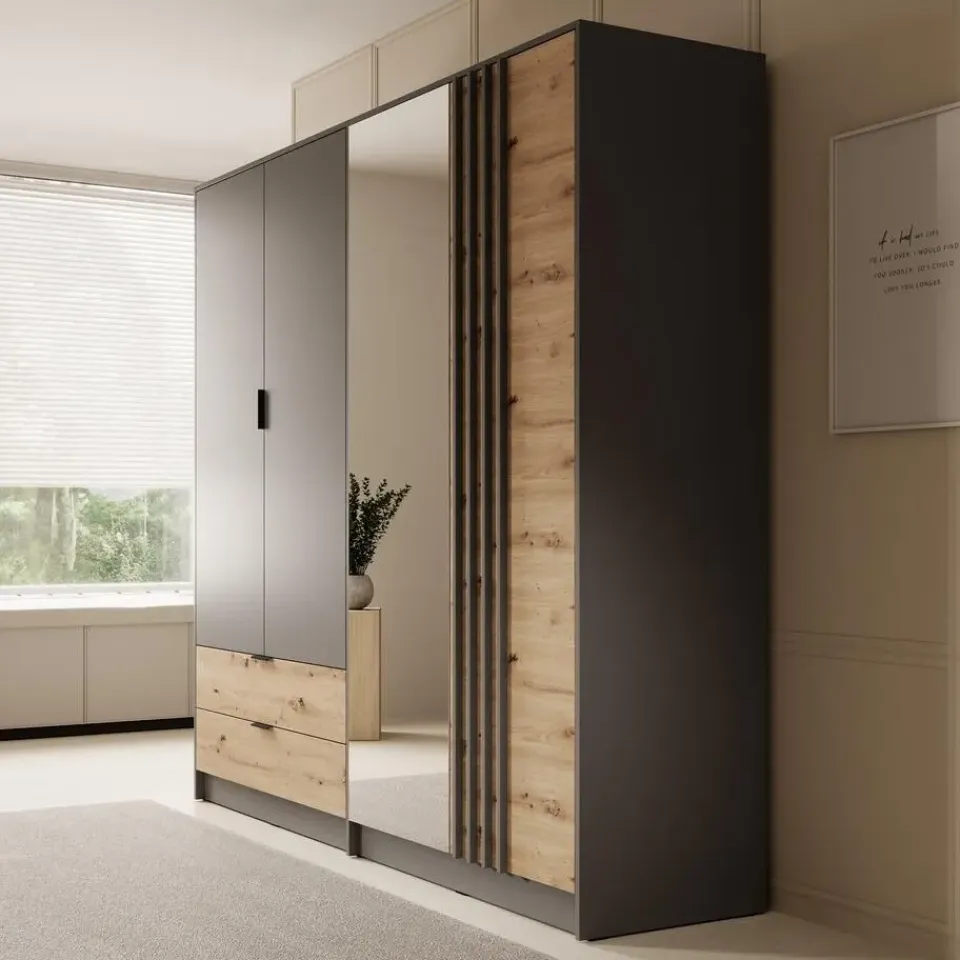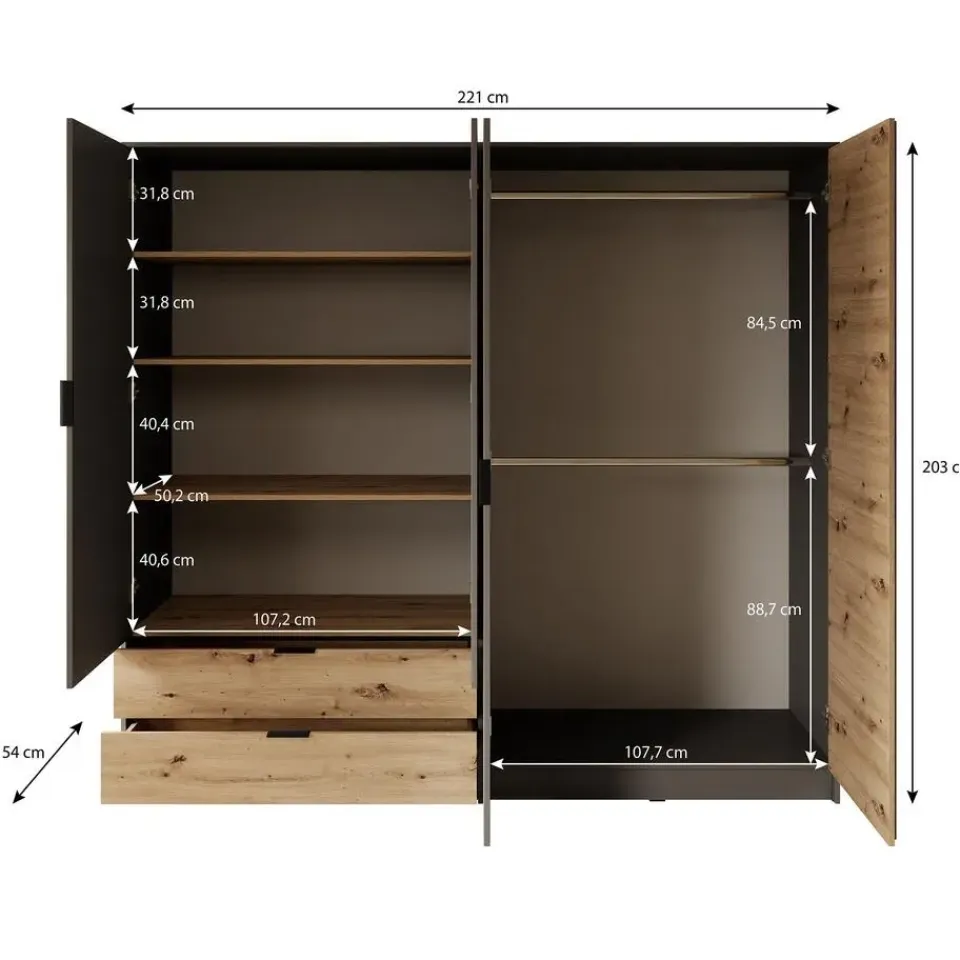 Kledingkast Roma is voorzien van 4 scharnierdeuren en 2 lades. De lades en deuren openen met zwarte handgrepen. Ook beschikt deze garderobekast over een spiegel. De binnenkant bestaat uit 4 opbergvakken en 2 kledingroedes. Het meubel wordt ongemonteerd geleverd. Je dient het dus met behulp van de bijgeleverde handleiding zelf in elkaar te zetten.