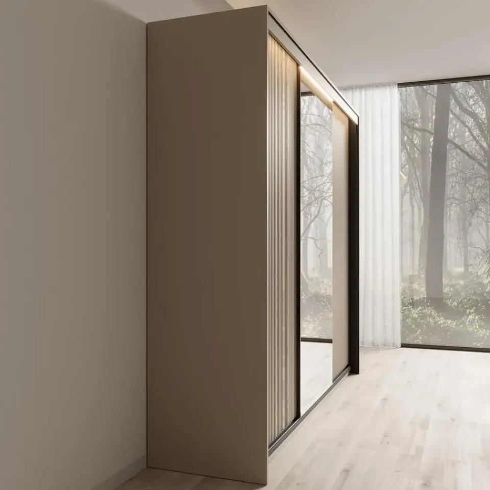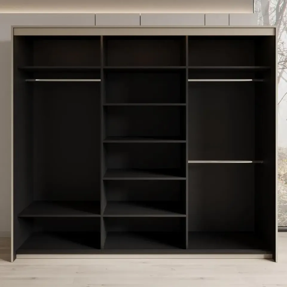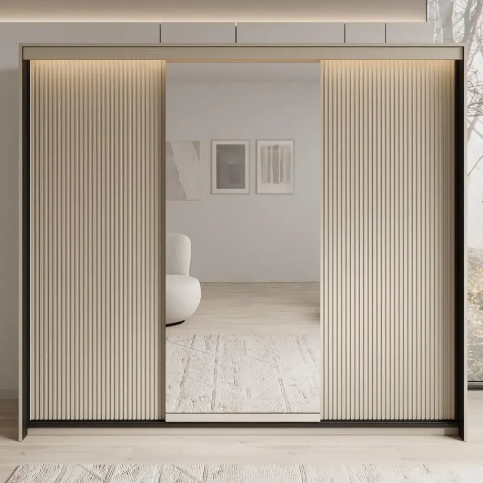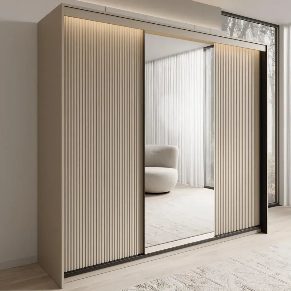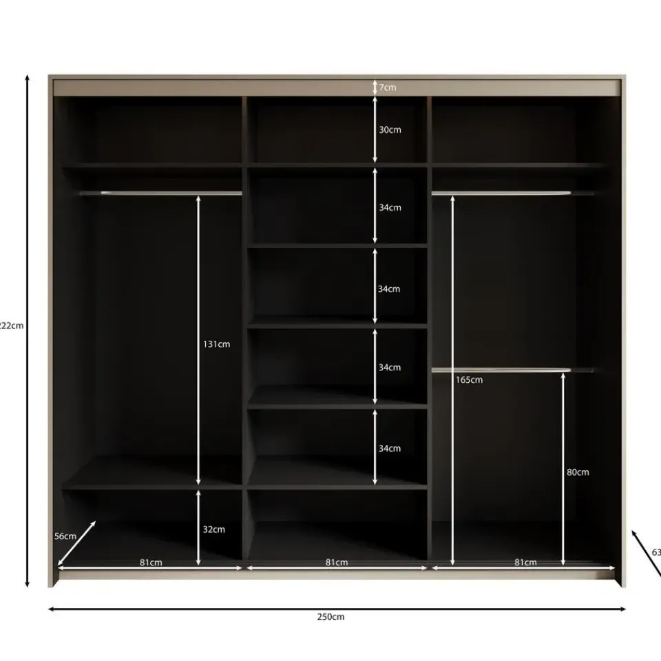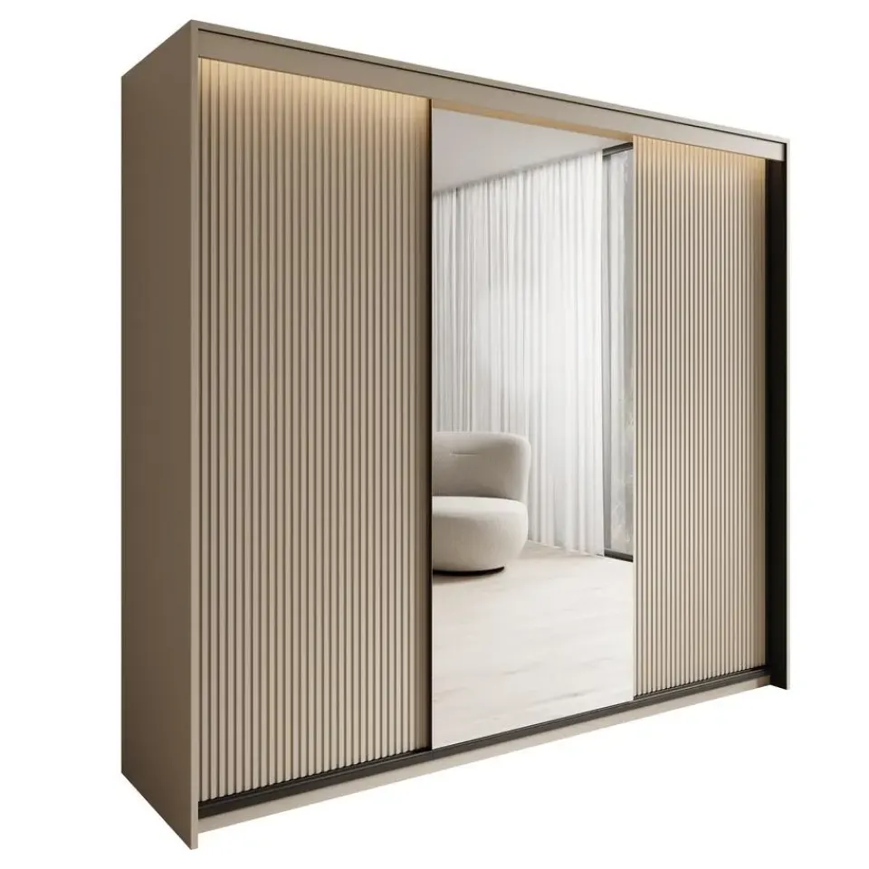 De Timoteo is gemaakt in beige en beschikt over 3 schuifdeuren. De middelste deur is voorzien van een spiegel, de andere 2 van een latten patroon. De binnenkant bestaat uit 9 opbergvakken en 3 kledingroedes. Wordt geleverd inclusief LED-verlichting. Het meubel wordt ongemonteerd geleverd. Je dient het dus met behulp van de bijgeleverde handleiding zelf in elkaar te zetten.