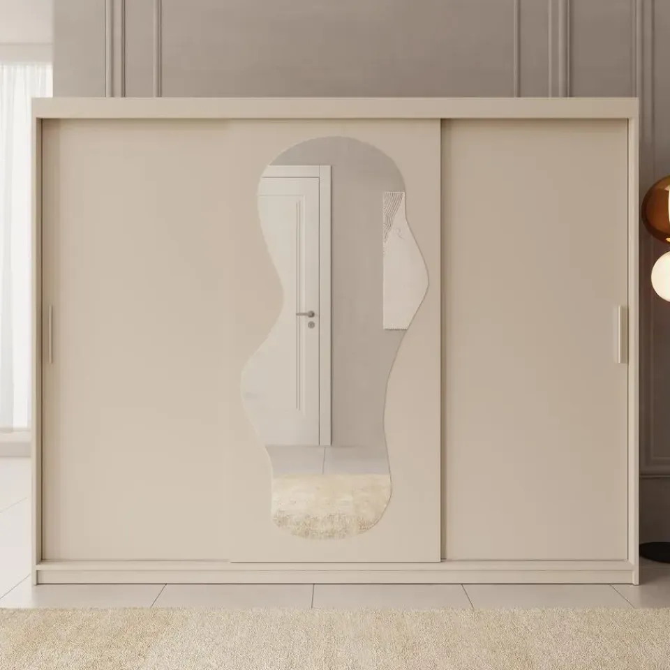 Kledingkast Ulysses beschikt over 3 schuifdeuren die openen met zilverkleurige handgrepen. De middelste deur is voorzien van een speelse spiegel. De binnenkant bestaat uit 10 opbergvakken en 2 kledingroedes. De kast is uitgevoerd in beige kleur. Het meubel wordt ongemonteerd geleverd. Je dient het dus met behulp van de bijgeleverde handleiding zelf in elkaar te zetten.